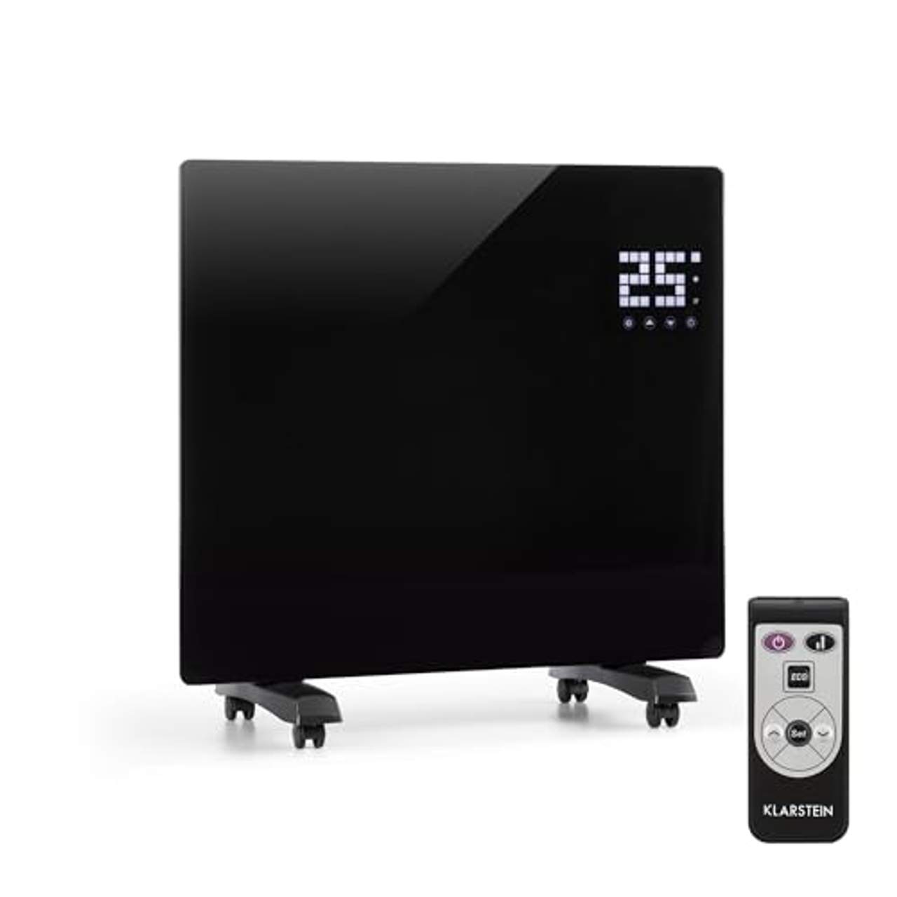 Klarstein Bornholm Single ElektroheizungSchwarze Eleganz erweckt kuschlige Gefühle und wohlige Wärme für Pantoffelschlurfer und Pyjamaträger: Das Klarstein Bornholm Single Konvektions-Heizgerät sorgt für eine gleichmäßige Temperaturerhöhung und Verteilung der Heizluft in Räumen bis zu einer Größe von 25 m 2 . Über zwei Heizstufen erwärmt das 1.000 Watt starke Klarstein Heizgerä t Räumlichkeiten bis 45 °C. Über ein Thermostat wird stets gradgenau die Wunschtemperatur eingehalten. Der ECO-Modus senkt den Energieverbrauch auf ein Minimum: Das schont die Umwelt und den Geldbeutel. Im Timing-Modus schaltet sich das Konvektionsheizgerät auf die Minute gemäß der vorgenommen Einstellungen ein und aus.Das Glaspanel des Klarstein Bornholm Sinlge ist spritzwassergeschützt und kann dementsprechend auch in Feuchträumen aufgestellt werden. Dank der Rollen an den Standfüßen kann das Gerät schnell und einfach in der Wohnung umgestellt werden. Ein Touch-Display in der rechten oberen Ecke der Glasfront dient zum Einstellen des Heizgeräts .