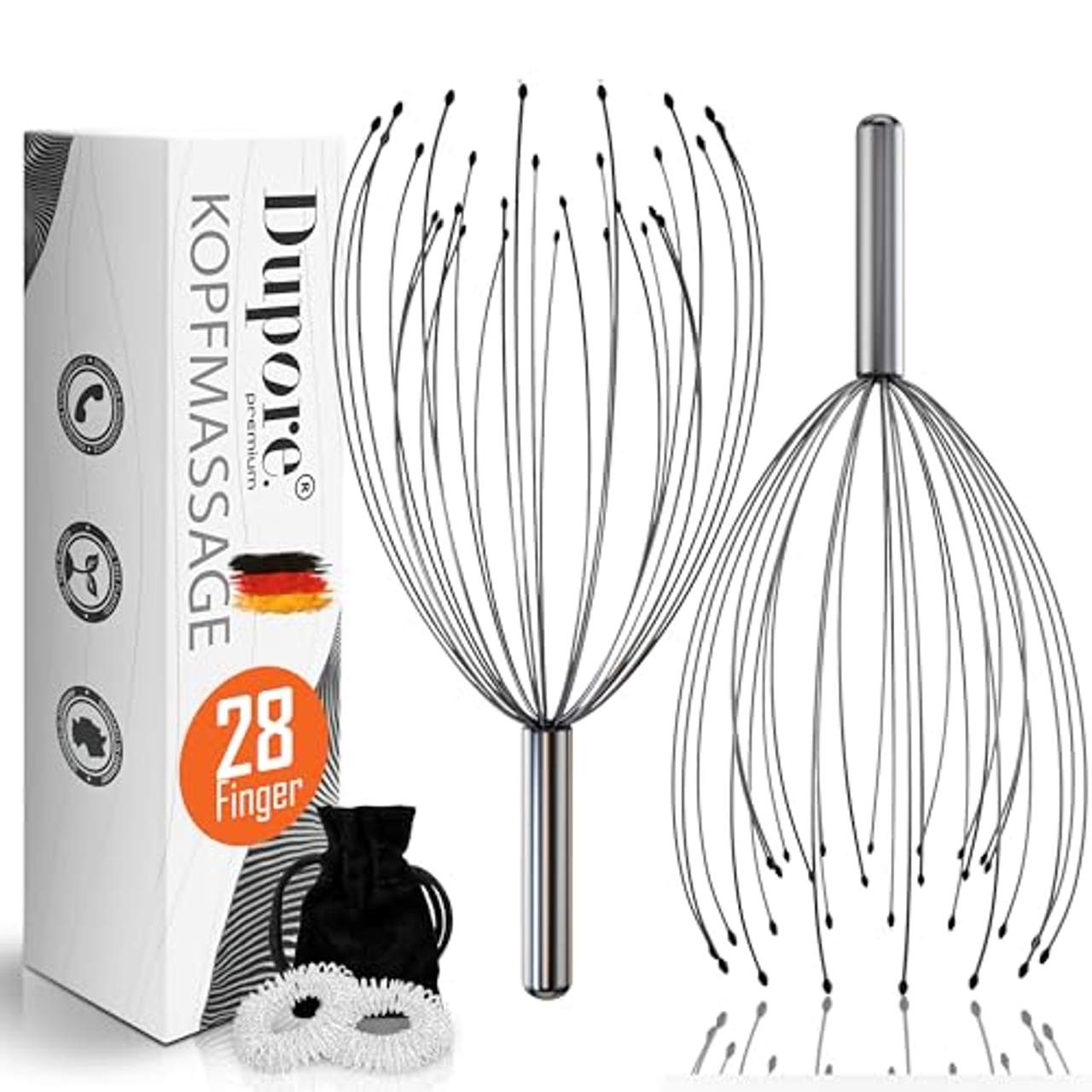 Die 4in1 Dupore Kopfmassagespinne ist ein Wellness-Set mit zwei Kopfmassagespinnen und zwei Fingermassageringen. Es setzt Glückshormone frei, um Entspannung und Wohlbefinden zu fördern, regt die Kopfhaut und das Haarwachstum an, fördert eine effektive Blutzirkulation und bietet Entlastung für Hände und Finger. Das Produkt stammt von der deutschen Firma Dupore, die eine Geld-zurück-Garantie bis zu 501 Tage nach dem Kauf verspricht.