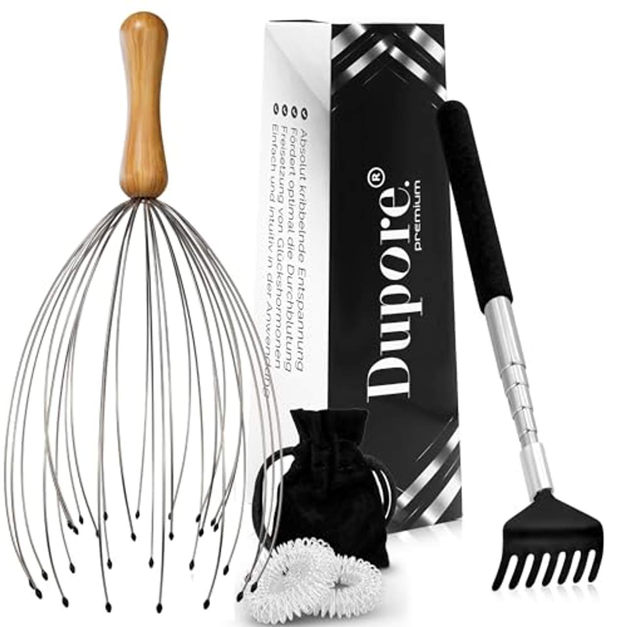 Die Kopfmassagespinne von Dupore ist ein Produkt aus echtem Naturholz, das für Entspannung sorgt und eine optimale Blutzirkulation fördert. Sie hat 20 asymmetrische Massagefinger, die die Kopfhaut und die Haarwurzeln stimulieren. Außerdem setzt die Spinne Endorphine frei, die ein unvergleichliches Kribbeln und Glücksgefühle erzeugen. Zusätzlich enthält das Set einen Rückenkratzer und einen Fingermassagering für ein erstklassiges Entspannungserlebnis. Dupore bietet eine Geld-zurück-Garantie innerhalb von 50 Tagen nach dem Kauf, wenn Sie mit dem Produkt nicht zufrieden sind.