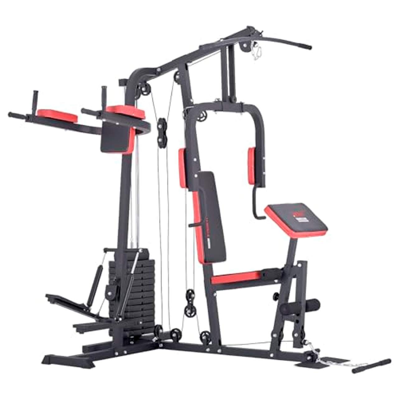 Die TrainHard Kraftstation Multistation Fitnessstation hat einen schwarzen Rahmen und eine schwarz/rote Polsterung. Das Farbschema verleiht dem Gerät ein attraktives Aussehen, das sich gut mit anderen Fitnessgeräten kombinieren lässt.