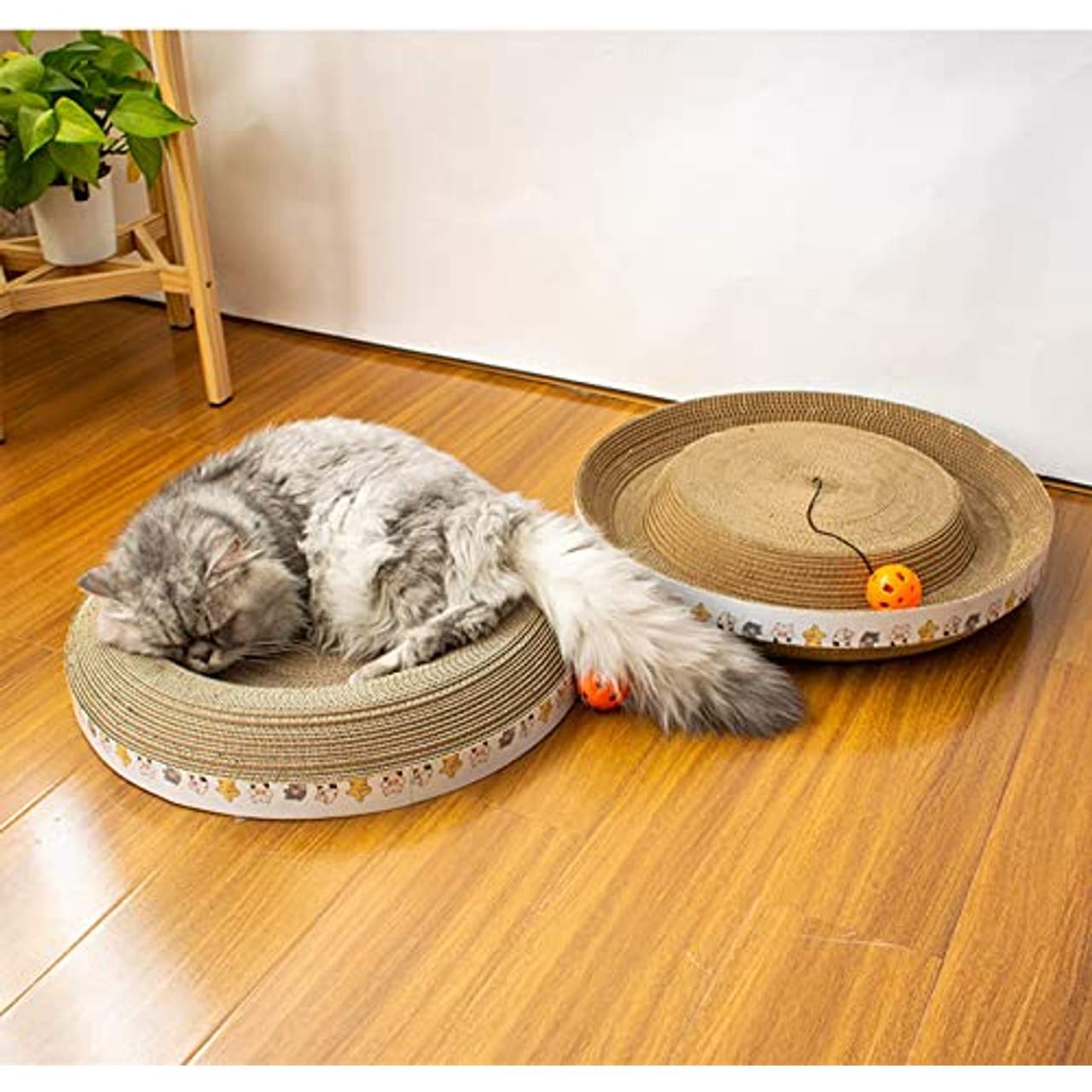 Das PETTOM Kratzbretter Katze Kratzpappe ist ein zweiseitiges Kratzspielzeug für Katzen. Es besteht aus hochverdichtetem, umweltfreundlichem und dickem Wellpapier, das abrieb- und kratzfest ist. Es besteht aus einem runden Kratzbrett mit einem Durchmesser von 46 cm und einem großen Nest, in dem sich die Katzen ausruhen können. Außerdem hat er einen eingebauten Glöckchenball, der Katzen anlockt und es ihnen ermöglicht, zu spielen und ihre Krallen zu schärfen. Und schließlich hilft es den Katzen, zu lange Krallen zu vermeiden und Möbel zu beschädigen.