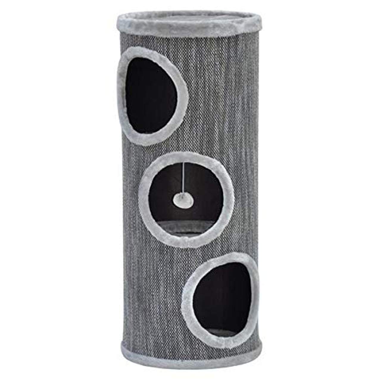 Die Nanook Katzen Kratztonne ist ein Kratzmülleimer in grauer Farbe und Größe XL (100 cm Höhe x 40 cm Breite). Sie hat einen großen 40 cm Ø Boden für Stabilität, 22 cm Ø Eingangslöcher zur Katzenhöhle und einen weichen Plüschbezug. Sie eignet sich perfekt als Spielturm, Versteck und Rückzugsort und ist mit ihrer strukturierten Stoffhülle ein echter Hingucker. Im Inneren sind alle Etagen zugänglich, ein Plüschball ist enthalten. Von der oberen Liegefläche aus können die Katzen ihre Umgebung ideal beobachten.
