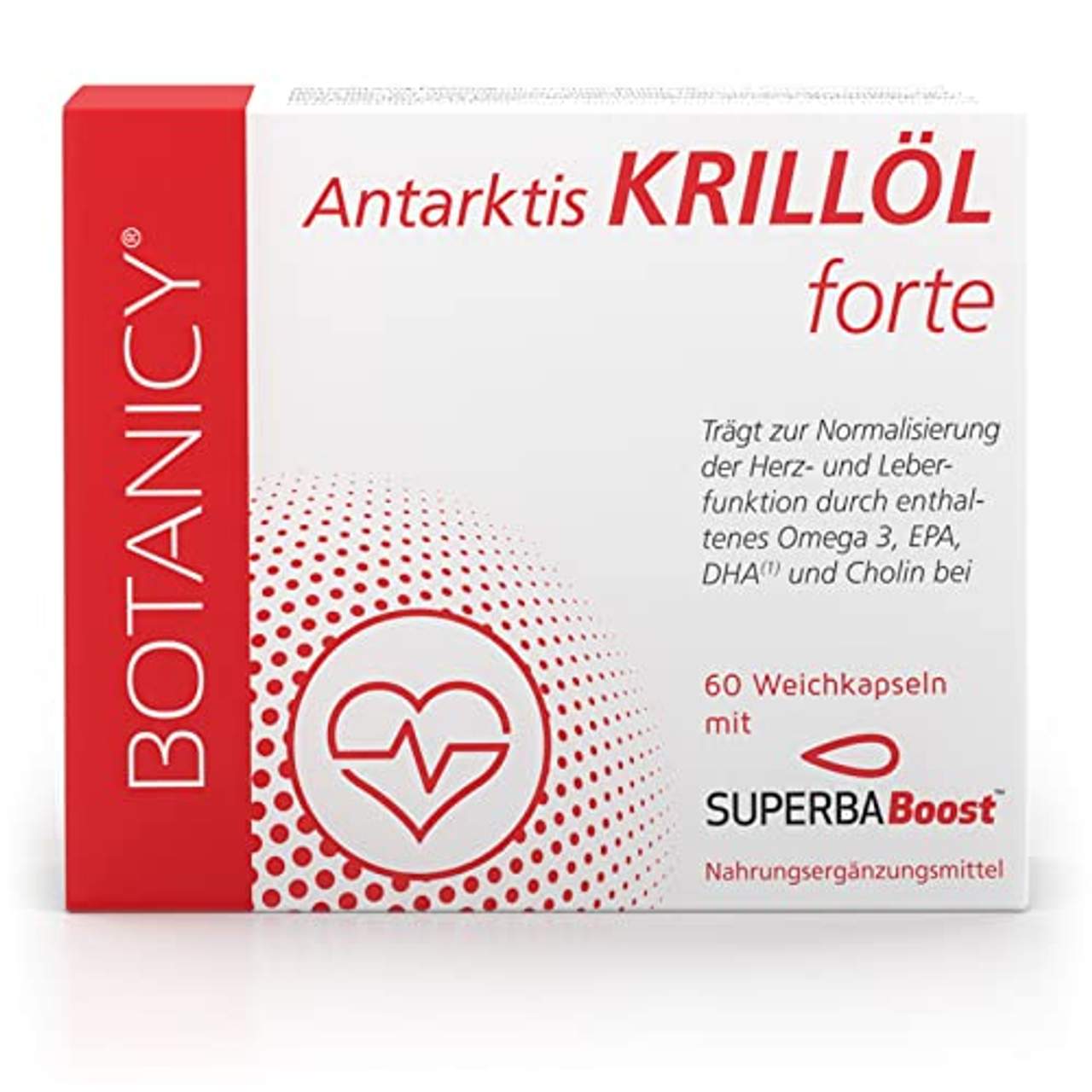 Das Produkt heißt „Antarktis Krillöl Forte Omega 3“ von Botanicy. Es enthält Krillöl, Astaxanthin und Cholin für die Herzgesundheit, die Leberfunktion und den Fettstoffwechsel. Die Qualität des Krillöls wird von einem deutschen Institut geprüft, um sicherzustellen, dass es von höchster Qualität ist, und das zu einem vernünftigen Preis. Die Kapseln sind leicht zu schlucken und haben weniger fischiges Aufstoßen als andere Fischölkapseln.