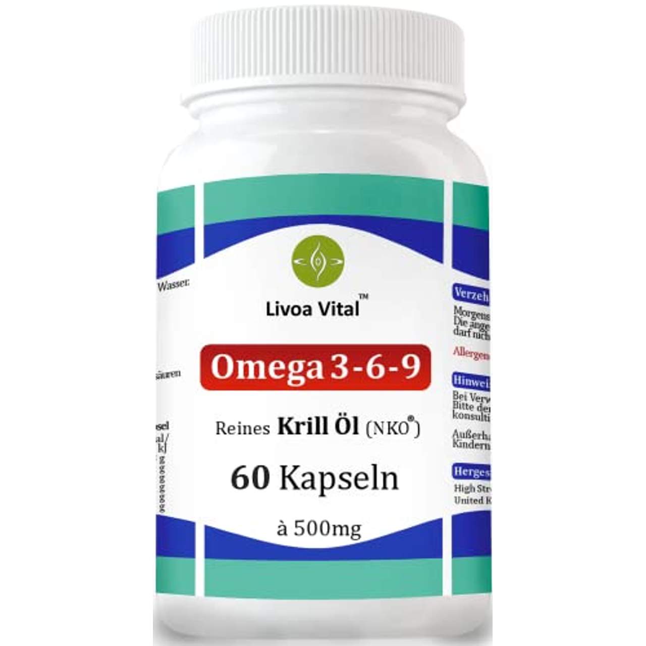 NKO Krillöl Omega 3-6-9 Kapseln Hochdosiert ist ein hochdosiertes Krillölprodukt der Marke „Livoa Vital“. Es enthält 500 mg Krillöl mit Omega-3-, -6- und -9-Fettsäuren. Außerdem enthält es Astaxanthin, ein Antioxidans, das 48-mal wirksamer ist als Fischöl. Außerdem ist es frei von Laktose, Gluten, Zucker, Salz, Eiern und Hefe. Zu seinen vorteilhaften Eigenschaften gehören ein niedrigerer Cholesterinspiegel, die Linderung prämenstrueller Symptome, ein besseres Gedächtnis und eine bessere Konzentration, glatte Haut, volles Haar und starke Nägel, Muskelaufbau und Fettverbrennung.