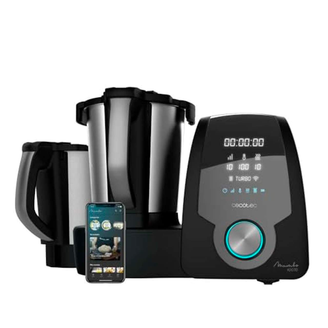 Cecotec Multikocher Mambo 10070, 30 Funktionenemulgiert, mischt, kocht, rührt, dämpft, blanchiert, konfitiert, knetet, kocht bei niedriger Temperatur, kocht, hält warm, fermentiert, Slow Mambo, Kocht mit Präzision Grad für Grad, Wasserbad, Schongaren, Geschwindigkeit Null und hat Turbo-Funktion. Entdecke die App, die Schritt für Schritt geführte Rezepte, voreingestellte Modi und handbetriebenen DIY-Modus bietet.Mit Küchenwaage, die die Zutaten im Gefäß wiegt, um exakte Menge zuzubereiten und perfekte Ergebnisse zu erhalten. Hochwertiger spülmaschinengeeigneter Edelstahl-Krug. Die Geschwindigkeit null ermöglicht das Kochen und Anbratten ohne Geschwindigkeit wie einer Schmortopf oder Pfanne. Außerdem kann man ohne Deckel kochen.Die innovative Soffritto-Funktion bei höheren Temperaturen, um die Lebensmittel anzubräunen erreicht man mit der maximalen Temperatur und Leistung. Exklusiver MamboMix Löffel zum Kneten. Errecicht gleichförmigere und größere Teige, weil der Löffel sie nicht schneidet. Der Kochtopf beträgt bis zu 3,3 l