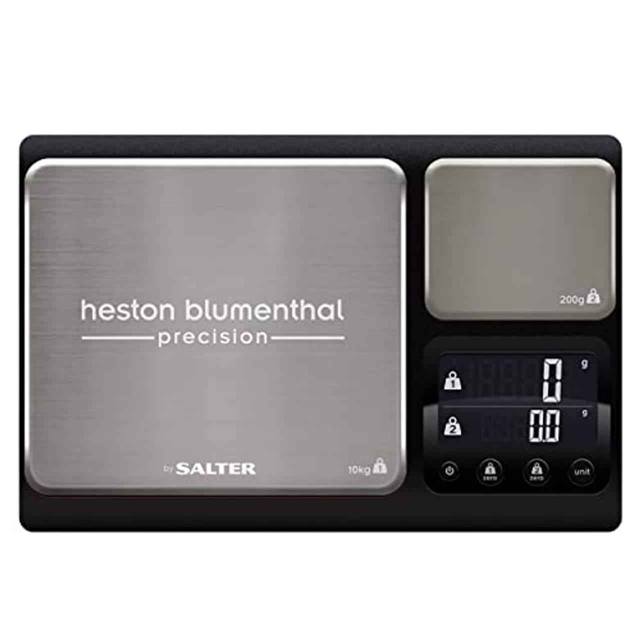 Heston Blumenthal digitale KüchenwaageDie große Hochleistungsplattform (10 kg) wird in 1-g-Schritten gemessen. Die Premium-Plattform (200 g) wird in 0,1-g-Schritten gemessen Addier- und Wiegefunktion Aquatronic-Funktion Plattformen aus Edelstahl Aufbewahrungsbehälter.