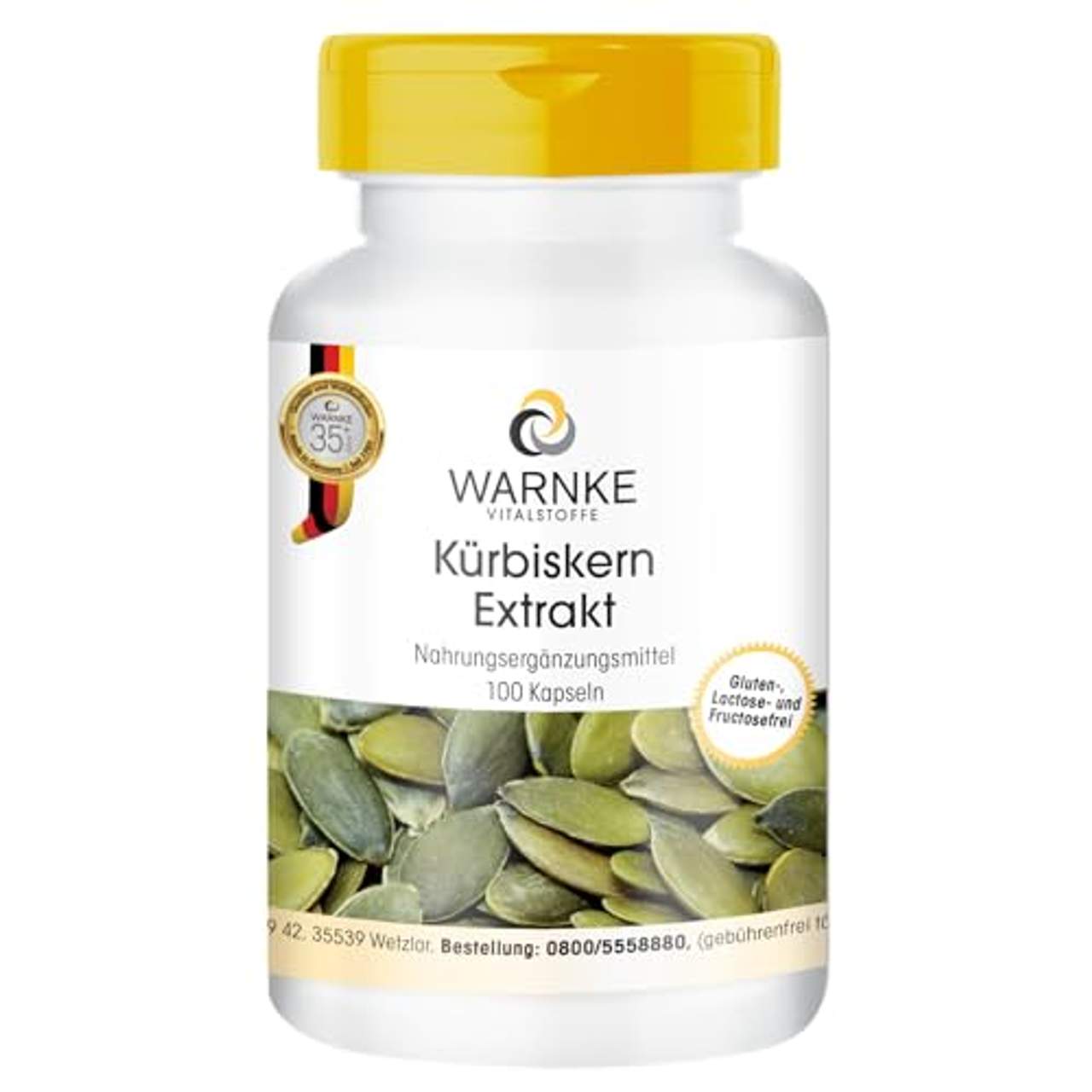 WARNKE VITALSTOFFE Kürbiskern-Extrakt 500mgPZN: 03088780 Kürbiskern Extrakt 100 Kapseln Kürbiskern Extrakt mit Vitamin E und Selen Lactosefrei, Glutenfrei, 100% VEGI, Gelatinefrei Zutaten: Kürbiskernextrakt (80%), Überzugsmittel Hydroxypropylmethylcellulose (Kapselhülle), D-alpha-Tocopheylacetat, Selenhefe (0,8% enthält 0,2% Selen), Trennmittel Magnesiumsalze der Speisefettsäuren, Trennmittel Siliciumdioxid Verzehrempfehlung: Erwachsene täglich 1 Kapsel mit viel Wasser. Kühl und trocken lagern. Außerhalb der Reichweite von kleinen Kindern aufbewahren. Schwangere und Stillende, Personen, die regelmäßig Medikamente einnehmen, sowie Personen mit behandlungsbedürftigen Krankheiten sollten vor dem Verzehr mit ihrem Arzt Rücksprache halten.Die angegebene empfohlene tägliche Verzehrmenge darf nicht überschritten werden. Dieses Produkt sollte nicht als Ersatz für eine ausgewogene und abwechslungsreiche Ernährung und eine gesunde Lebensweise verwendet werden. LMIV als PDF Nettofüllmenge 20,00 g/