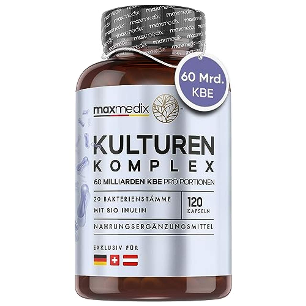 MaxMedix Kulturen KomplexOptimale Zusammensetzung - Unser Kulturkomplex enthält 20 ausgewählte Bakterienstämme und zusätzlich Bio Inulin für Ihr allgemeines Wohlbefinden. In unseren probiotischen Milchfermenten finden Sie verschiedene Stämme wie Lactobacillus Rhamnosus, Lactobacillus Reuteri, Lactobacillus Gasseri und Lactobacillus Paracasei. Mit 60 Milliarden Organismen bieten wir Ihnen die optimale Dosierung zu einem fairen Preis-Leistungsverhältnis.Gute Bakterienstämme - Probiotika sind gute Bakterien, die zur Gruppe der Milchsäurebakterien gehören und im Magen Darm Trakt vorkommen. Unsere Kapseln enthalten unter anderem Bifidobacterium Breve, Bifidobacterium Longum, Lactobacillus Gasseri, Lactobacillus Acidophilus, Lactobacillus Bulgaricus, Lactobacillus Casei, Lactobacillus Reutri, Lactobacillus Rhamnosus sowie Streptococcus Thermophilus und Enterococcus Faecium.Milchsäurebakterien für Erwachsene - Unser probiotisches Nahrungsergänzungsmittel mit Präbiotika (Inulin) enthält 120 leicht zu schluckende Kapseln für eine 2-monatige Versorgung. Um den Bedürfnissen unserer Kunden gerecht zu werden, haben wir vegane, laktosefreie und glutenfreie Milchsäureenzyme verwendet. Wir empfehlen die Einnahme von 2 Kapseln pro Tag mit einem Glas Wasser. Vegan & Nachhaltige Verpackung - Wir sind stolz auf die Qualität; die wir unseren Kunden bieten. Sie werden gemäß GMP Standards unter strengen europäischen Richtlinien hergestellt. Unsere Kultur Komplex Kapseln sind frei von Gluten, Laktose, Aromen, Farbstoffen und Allergenen. Unsere Produkte sind klimafreundlich und wir verwenden recycelbare Verpackungen, um so unsere CO2 Emissionen zu reduzieren.
