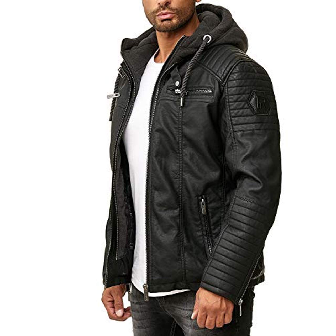 - Trendiges Design: 1. Trendiges Design: Die "Redbridge Herren Kunst- Lederjacke Kunstleder Bikerjacke" zeichnet sich durch eine zeitgenössische Ästhetik aus, die klassisches Kunstleder mit modernen Elementen wie einer hellen, kontrastierenden Kapuze verbindet. Diese stilvolle Kombination steigert nicht nur den optischen Reiz der Jacke, sondern ermöglicht es ihren Trägern auch, ein modisches Statement abzugeben und gleichzeitig den Komfort eines vielseitigen Stücks zu genießen. Das trendige Design sorgt dafür, dass die Jacke zu verschiedenen Anlässen getragen werden kann, von legeren Ausflügen bis hin zu modischen Events, und macht sie zu einem unverzichtbaren Bestandteil der Garderobe eines jeden Mannes.