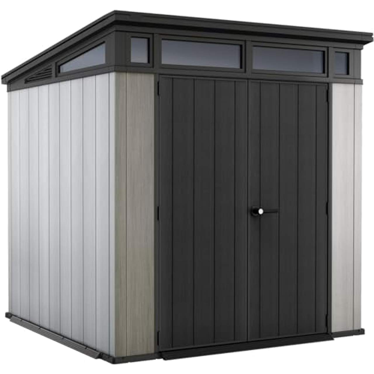 Keter Gerätehaus Artisan 7x7Das Tepro Kunststoff-Gerätehaus Artisan 7x7 in der Farbe Schwarz-Grau hat die Maße 226 cm x 214 cm x 218 cm und bietet Ihnen eine hochwertige Möglichkeit Ihre Gartengeräte und vieles mehr platzsparend und geordnet Unterzubringen. Mit einem Rauminhalt von ca. 8,27 m³ bietet es ausreichend viel Platz und vielfältige Verwendungsmöglichkeiten, womit es ideal für jeden passionierten Hobbygärtner und Heimhandwerker geeignet ist. Es ist aus dem hochwertigen, speziell entwickelten Material DOUTECH gefertigt und kombiniert ein natürlich ästhetisches Holz-Design mit höchster Stabilität sowie mit einer hohen Beständigkeit gegen witterungs- und UV-Einflüssen.Zusätzlich ermöglicht Ihnen das wartungsarme, langlebige Material einen persönlichen Gestaltungsfreiraum und kann bedenkenlos, frei nach Ihrem Geschmack in jeder beliebigen Farbe angestrichen werden. Das moderne, naturnahe Design des Kunststoff-Gerätehauses passt sich optimal Ihrer Gestaltung an und präsentiert sich als ein absolutes Highlight in Ihrem Garten.Das Artisan Haus ist mit einem praktischen Pultdach, einer 148,5 cm breiten und 182,4 cm hohen Doppeltür inklusive Türverschlusssystem aus Edelstahl sowie mit einem modernen Lichtband für die Tageslicht-Beleuchtung ausgestattet. Dadurch ist sowohl die optimale Beleuchtung als auch die Sichere Aufbewahrung des Inhalts gewährleistet. Die vorgeschnittenen Nut-Feder-Paneele garantieren eine einfache und besonders schnelle Montage.