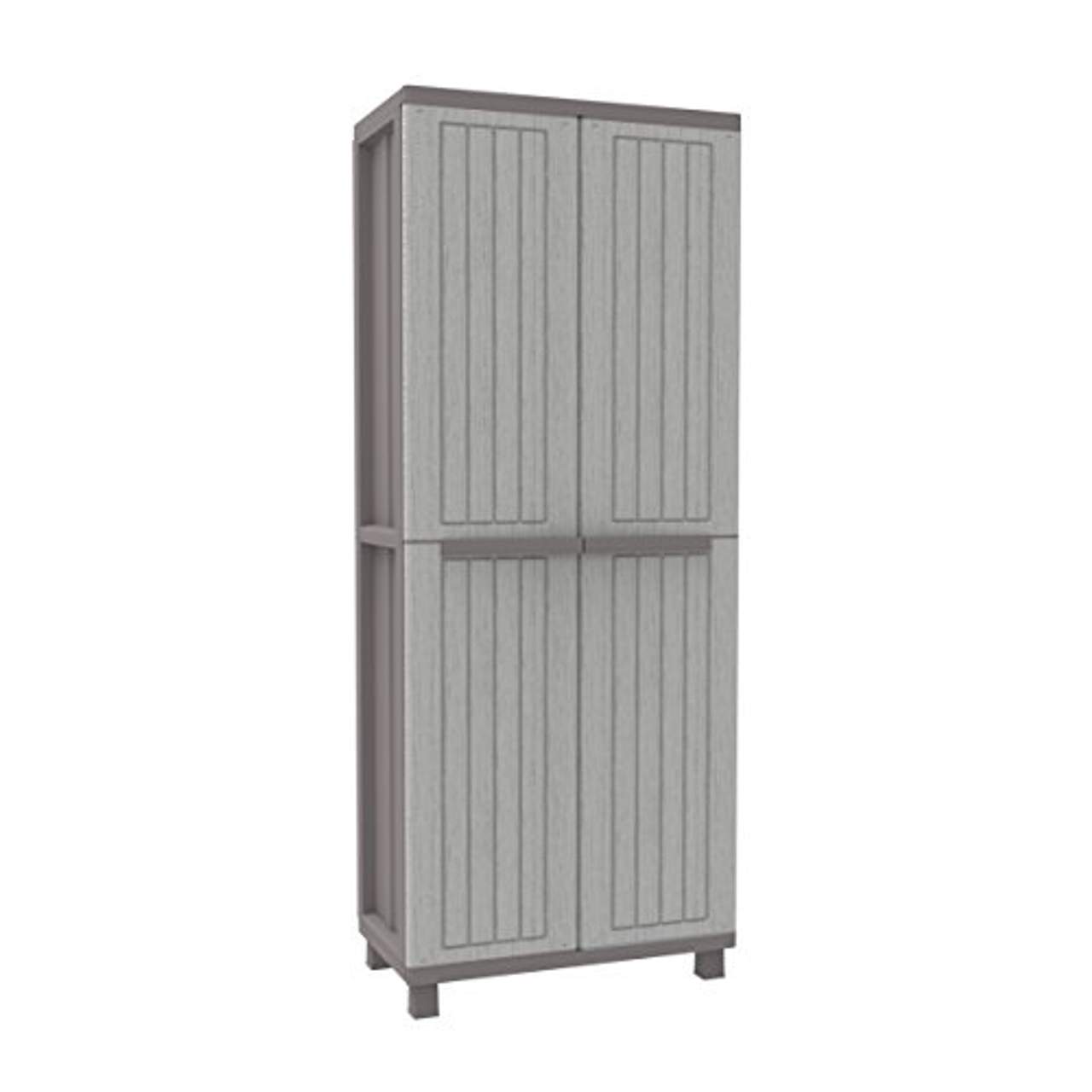 Terry JWood 268 Schrank* 2-türiger Spindschrank aus Kunststoff in Holzoptik * 3 höhenverstellbare Einlegeböden mit jeweils einer maximalen Tragkraft von 20 kg / Boden bei gleichmäßiger Verteilung * Die Türen können bis zu 180° Grad geöffnet werden * Schnell und einfach aufbaubar * Mit Vorrichtung für Vorhängeschloss (nicht im Lieferumfang enthalten) Abmessungen (B x H x T): 68 x 170 x 37,5 cm Farbe: Taupe / Grau Lieferumfang * 1 x Kunststoffschrank J-Wood 268