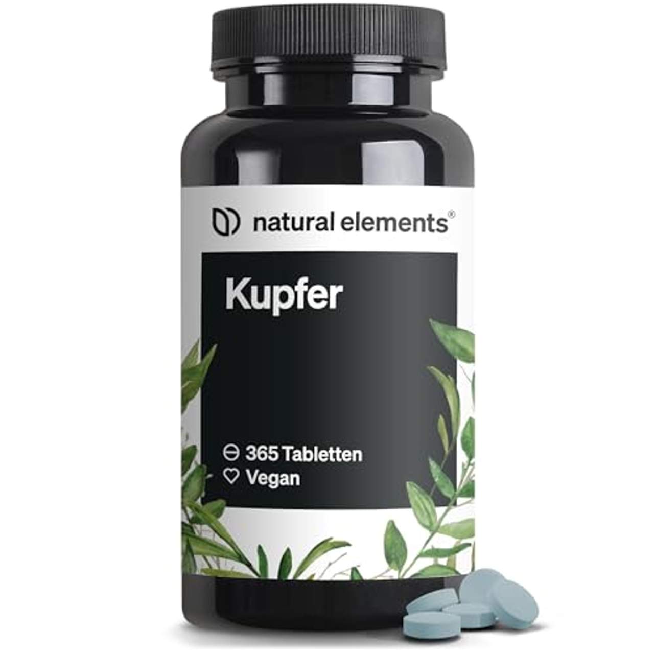 natural elements Kupfer ist eine Kupfertablette, die viele Vorteile für dein Wohlbefinden bietet. Es unterstützt dein Immun- und Nervensystem, hilft beim Eisentransport, erhält ein gesundes Bindegewebe und beeinflusst sogar die Pigmentierung deiner Haut und Haare.