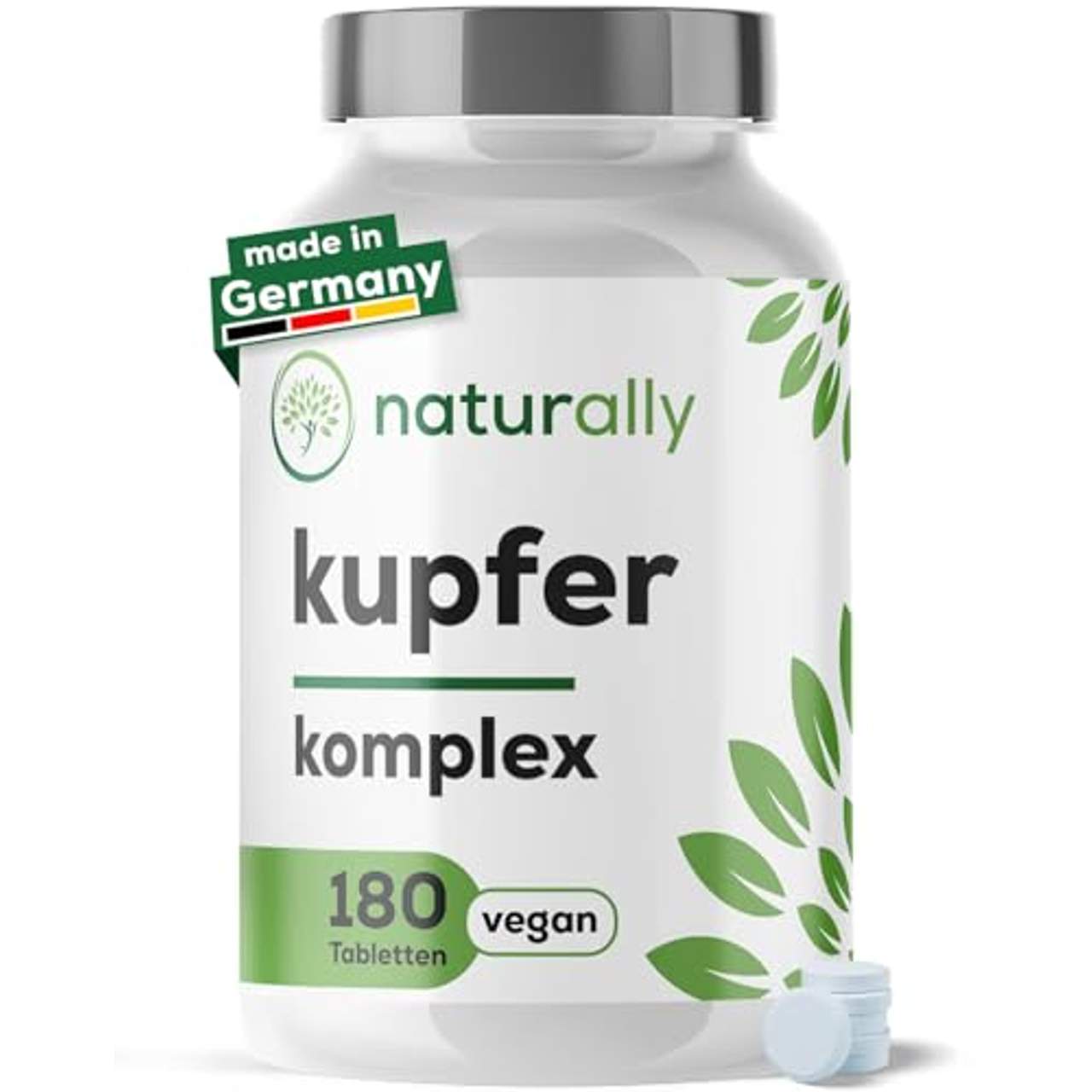 naturally 2mg Kupfer TablettenMit Kupfer Komplex sind Sie bereit, sich selbst zu schützen! Jede Dose verfügt über 180 kleinformatige, leicht schluckbare Tabletten, die jeweils 2mg hochdosiertes Kupfer aus Kupferbisglyzinat, Kupfergluconat und Kupfercitrat enthalten. Mit der Kraft von Kupfer haben Sie ein starkes Immunsystem, gesundes Haar und strahlende Haut.