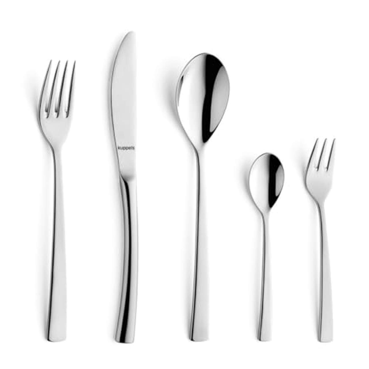 Das Kuppels Besteckset Soul enthält 6 Tafelgabeln, 6 Esslöffel, 6 Tafelmesser, 6 Kuchengabeln und 6 Kaffeelöffel. Dieses umfassende Set bietet alle wichtigen Utensilien, die du für ein komplettes Esserlebnis brauchst.