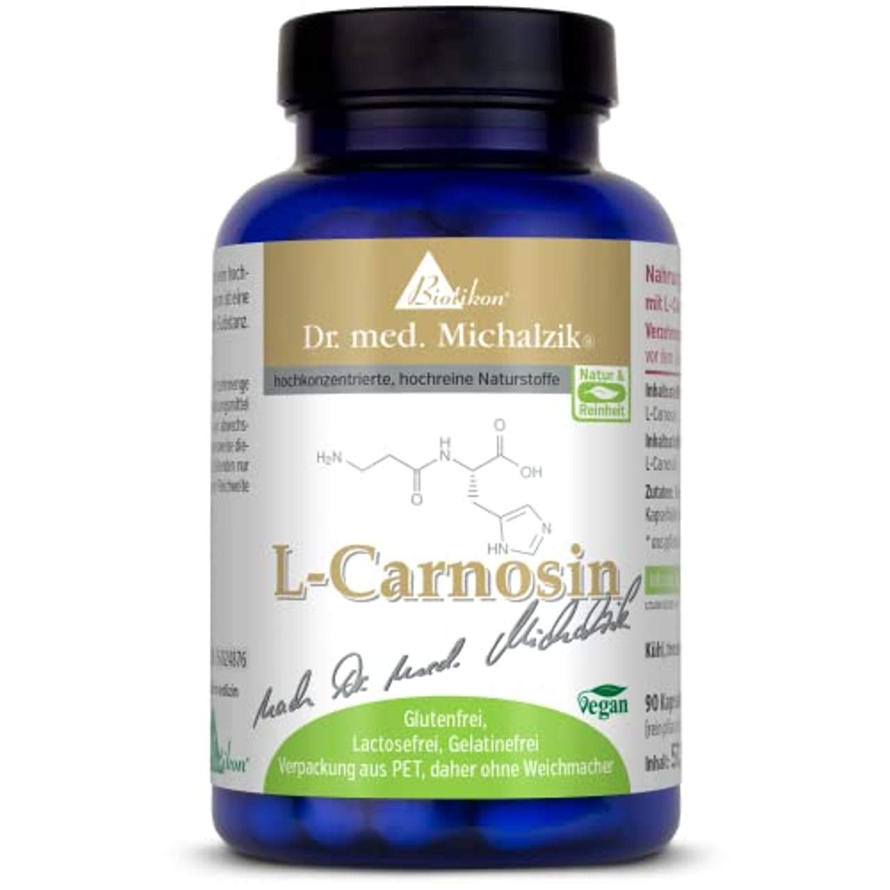 L-Carnosin bestandteil von Muskel- und Gehirn-Gewebe90 Kapseln frei von Zusatzstoffen in der Kapselfüllung wie Magensiumstearat. In den vegetarischen Kapseln ist nur reines L-Carnosin enthalten. L-Carnosin (N-beta-Alanyl-Histidine) ist eine wichtige Aminosäureverbindung. Im Körper natürlich vorkommende wichtige Substanz. Vegane Nahrungsergänzung! Unser Produkt ist OHNE Magnesiumstearat.Hergestellt in Deutschland nach Dr. med. Michalzik Produkt-Garantie: Hochwertige Qualität für Ihre Gesundheit.