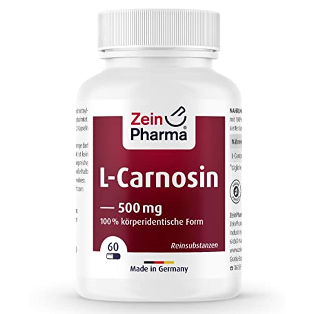 - Hergestellt in Deutschland: Alle "ZeinPharma" L-Carnosin-Kapseln werden ausschließlich in Deutschland unter strengen Produktions- und Hygienevorschriften hergestellt, um die Sicherheit und Wirksamkeit für die Kunden zu gewährleisten.