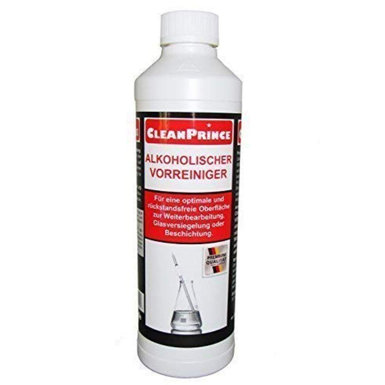 CleanPrince Alkoholischer Vorreiniger 500mlALKOHOLISCHER VORREINIGER Für eine optimale und rückstandsfreie Oberfläche zur Weiterbearbeitung, Glasversiegelung oder Beschichtung. Produktinformationen: CleanPrince Alkoholischer Vorreiniger bereitet Oberflächen auf eine nachstehende Versiegelung vor. Hiermit behandelte Flächen werden restlos von Fett, Öl, Wachs, Ruß und Teer befreit.Eine anschließend aufgetragene Versiegelung findet somit den optimalen Haftgrund. Anwendungsbereiche: CleanPrince Alkoholischer Vorreiniger dient zur rückstandsfreien Vorreinigung zu versiegelnder nicht saugender Oberflächen aus Glas, Lack, Kunststoff, Laminat, Keramik, Fliesen oder Ziegel. Benutzungshinweise: Den Vorreiniger auf ein sauberes trockenes Tuch auftragen und damit die trockene und grundgereinigte Oberfläche gleichmäßig einreiben und abtrocknen lassen.Ergiebigkeit: 30 m² je Liter Reiniger Art.-Nr.: CP400450 Sicherheitshinweise zur Anwendung: Dieses Produkt ist grundsätzlich vor der Anwendung an verdeckter Stelle auf Verträglichkeit zu prüfen. Bei sachfremder Anwendung erlischt jegliche Haftung für mögliche Schäden. Inhaltsstoffe gemäß EG 648/2004 VO Detergenzien: 70 % Propan-2-ol (=Iso-propanol), < 0,2 % nichtionogene Tenside, Farb- und Duftstoffe