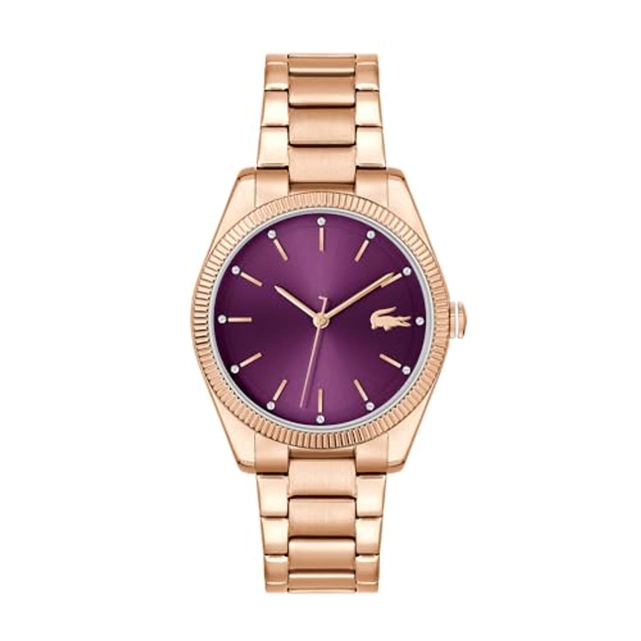 Eines der herausragenden Merkmale dieser Uhr ist ihr exquisites Design. Das feminine pflaumenfarbene Sonnenschliff-Zifferblatt ist mit funkelnden Kristallakzenten verziert, die das Licht wunderschön einfangen. Das kultige Lacoste-Krokodil-Logo auf der 3-Uhr-Position unterstreicht die stilvolle Anziehungskraft dieser Uhr und steht für ihre Qualität und Tradition.