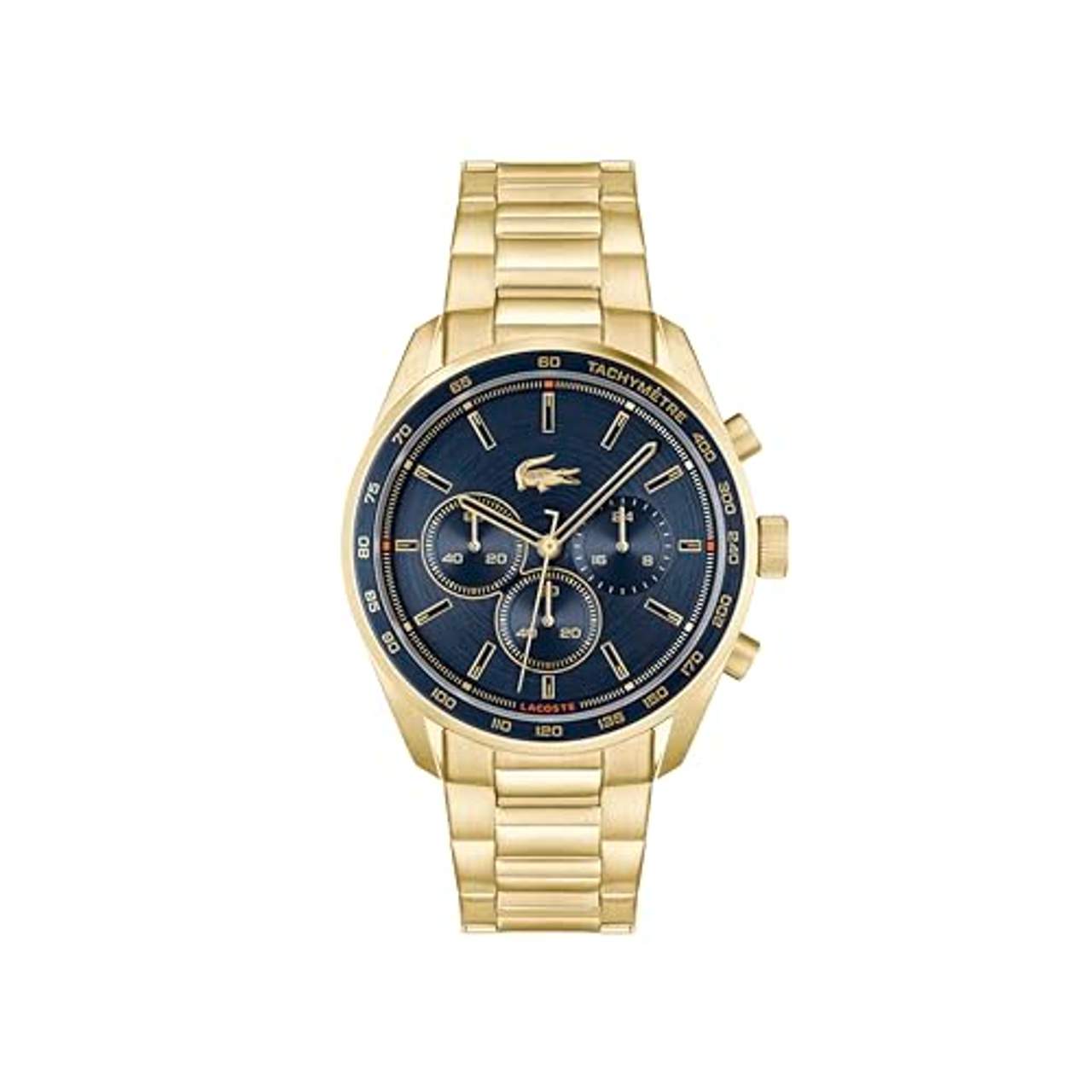 - Luxuriöses Edelstahlarmband: Mit seinem Edelstahlarmband mit Gelbgold-Ionenplattierung bietet der Lacoste Chronograph Quarz Uhr eine exquisite Mischung aus Luxus und Sportlichkeit, die jedes Ensemble aufwertet. Dieses luxuriöse Armband sorgt nicht nur für Langlebigkeit, sondern auch für einen hohen Tragekomfort am Handgelenk, sodass du die Uhr den ganzen Tag über ohne Beschwerden tragen kannst. Der auffällige Kontrast zwischen Edelstahl und Gelbgold-Ionenplattierung sorgt für visuelles Interesse und setzt gleichzeitig ein mutiges Modestatement, das all diejenigen anspricht, die hochwertige Materialien gepaart mit stilvollem Design schätzen.
