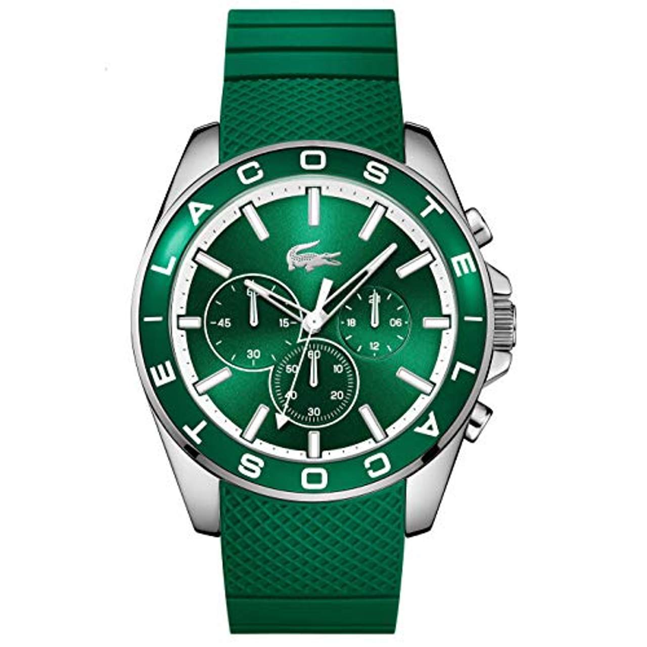 Lacoste Herren Chronograph Quarz Uhr 2010851Entworfen mit einem Schuss Farbe, bildet diese Green Lacoste-Uhr aus der Westport-Auflistung ein Super modisches Statement zu jeder Kleidung. Produziert mit einem Wasser-Widerstand von 50m, hat die Zeitmesser ein Silber-Edelstahl-Gehäuse neben einem Green Chronograph Zifferblatt, gekoppelt mit einem glatten Silikon-Armband mit Komfort für Verschleiß.Präsentiert in einer offiziellen Lacoste Uhr, kommt dieser Zeitmesser mit einem 2 Jahre Garantie.