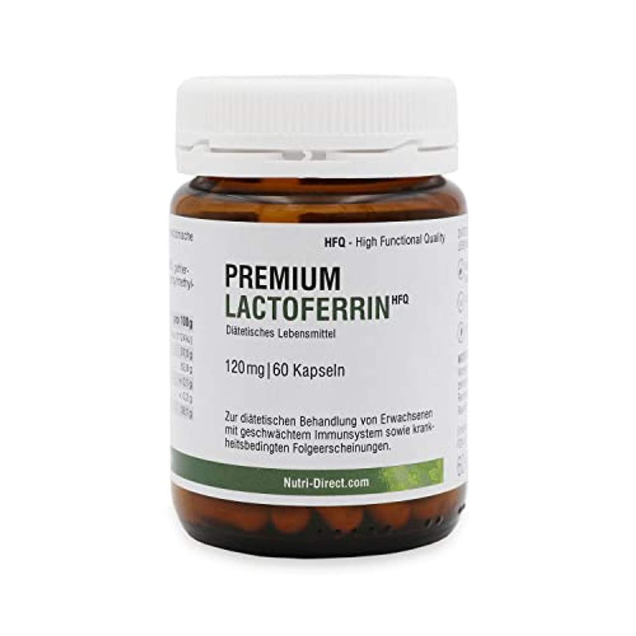 Lactoferrin 120mg 60 Kapseln magensäureresistent ist ein magensäureresistentes Produkt der Marke HFQ. Es hat >96% Reinheit, höchste biologische Aktivität und >19% Eisensättigung mit magenresistenten Zellulosekapseln für eine verbesserte Aufnahme im Darm. Es wird in der EU (Belgien und Deutschland) hergestellt und in Deutschland kontrolliert und registriert. Nutri-Direct bietet einen täglichen Versand mit Lieferung in 1-2 Tagen nach DE und 3-5 Tagen nach AT über DHL Deutschland. Es ist geeignet für Menschen mit geschwächtem Immunsystem und zur Optimierung des körpereigenen Eisenhaushaltes ohne künstliche Zusatzstoffe.