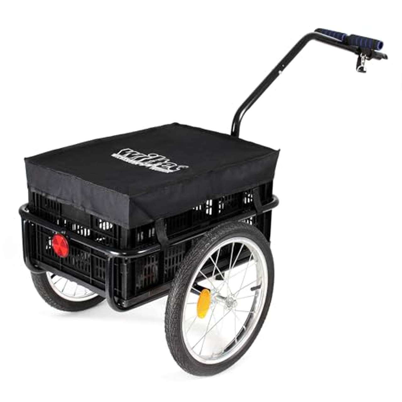 Fahrrad Lastenanhänger bis 50kg TransportanhängerDieser Lastenanhänger ist der ideale Begleiter wenn Sie Lasten mit dem Fahrrad transportieren müssen. Großeinkäufe oder sperrige Getränkekisten können mit seiner Hilfe problemlos nach Hause transportiert werden, sodass Sie nicht länger auf ein Auto angewiesen sind.Auch im Urlaub oder bei langen Radtouren überzeugt der Anhänger aufgrund seiner großzügigen Ladefläche. Besondere Stabilität erhält der Anhänger durch seine Stahlrahmenkonstruktion und der robusten Transportkiste aus Kunststoff, welche sich durch Witterungsbeständigkeit auszeichnet. Insgesamt lassen sich bis zu 50 kg auf dem Anhänger transportieren.Der Anhänger verfügt über eine universelle Kupplung, mit der er ganz leicht an der Hinterachse des Fahrrads befestigt werden kann. Die ca. 40 cm großen Luftreifen (16") sind mit zwei gelben Reflektoren ausgestattet die für eine bessere Sichtbarkeit im Dunkeln sorgen.Zusätzlich zur Nutzung am Fahrrad kann der Anhänger auch als Handwagen verwendet werden. Fahrrad Lastenanhänger