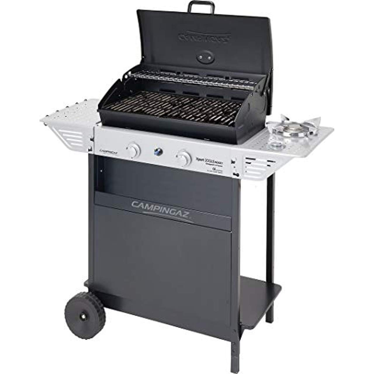 Campingaz Lavastein Gasgrill Xpert 200 LS RockyDer Xpert 200 LS Rocky von Campingaz ist ein kleiner, platzsparender, leichter Lavastein Gasgrill mit Seitenkocher und einer Grillfläche von 1.800cm². Die zwei aluminisierten Stahlbrenner bringen insgesamt 8,2 kW Leistung und sorgen für eine gleichmässige Hitzeverteilung auf der gesamten Grillfläche. Der zweiteilige Grillrost ist aus emailliertem Stahl, der Seitentisch ist abklappbar und ermöglicht eine platzsparende Lagerung. Als Sichtschutz ist an der Front des Grillwagens eine anthrazitfarbenen Stahlplatte mit Regal angebracht.Zwei große schwarze Kunststoffräder erleichtern den Transport des Grills.