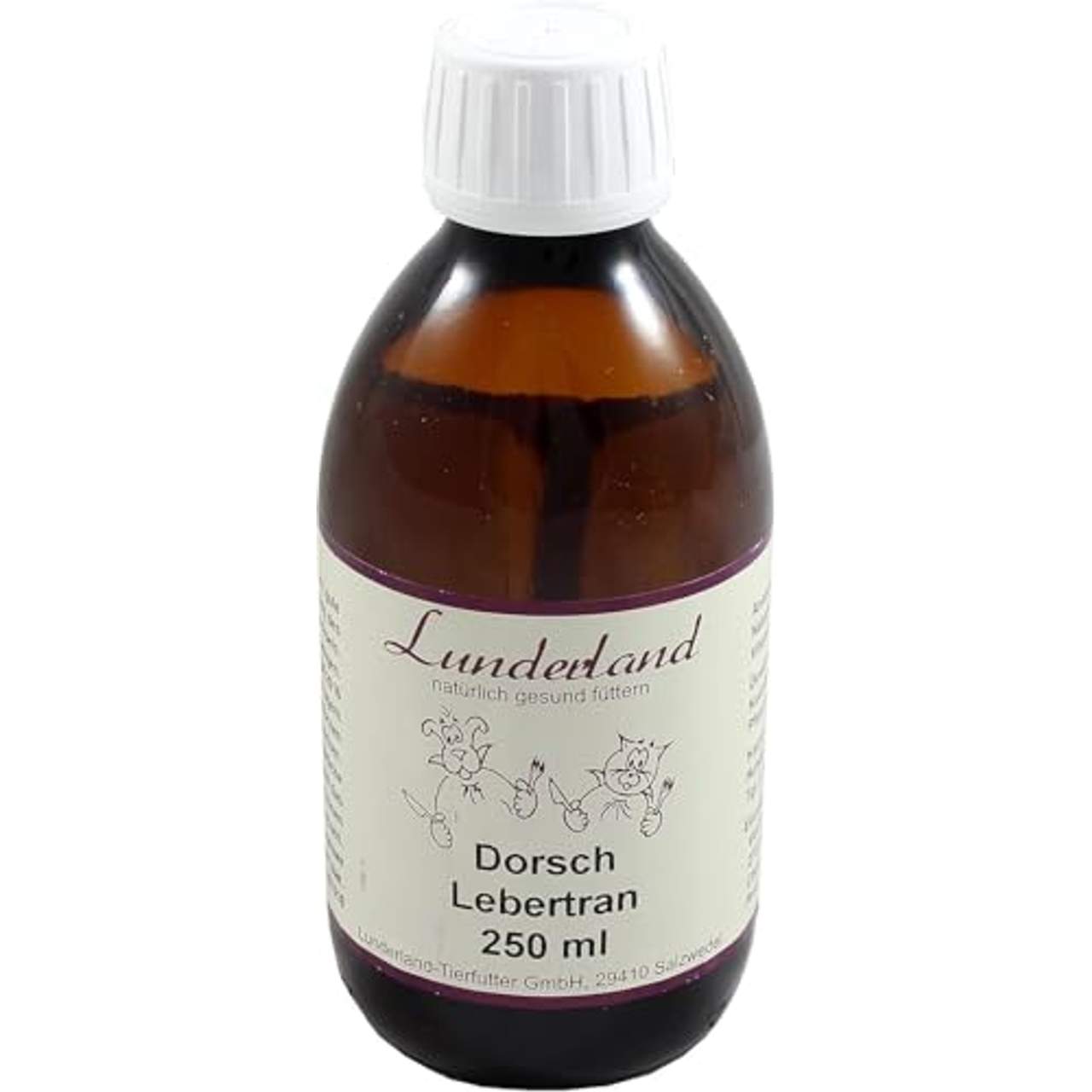 Dieses Produkt ist ein Lebertran der Marke „Lunderland“ mit dem Namen „Lunderland Dorschlebertran 250ml 1er Pack“. Es enthält kein billiges Pflanzenöl und hilft, ein schönes Fell zu gewährleisten und Haarausfall zu verhindern. Es kann als Nahrungsergänzungsmittel für Katzen, Hunde und andere Tiere verwendet werden. Vor allem enthält es Omega-3-Fettsäuren, die wichtige Nährstoffe für eine gesunde Haut, ein gesundes Fell und das allgemeine Wohlbefinden liefern.