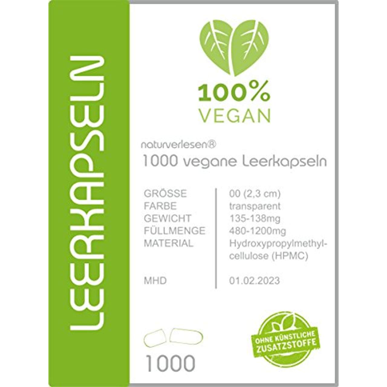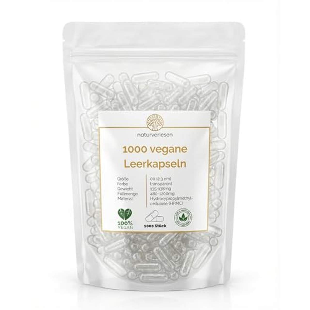 Bei diesem Produkt handelt es sich um 1000 Stück vegane Leerkapseln Größe 00 von der Marke „naturverlesen“. Es ist rein vegan, frei von Allergenen und Gluten sowie arzneimittelgeeignet. Der Hersteller ist international zertifiziert für Medizinprodukte mit einer langen Haltbarkeit (ca. 4,5-5 Jahre). Es wird in einer wiederverschließbaren Verpackung geliefert, um die Frische zu gewährleisten.
