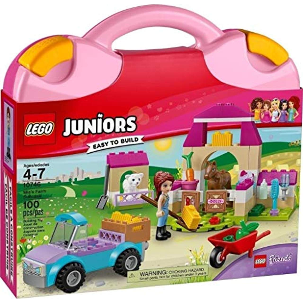 Lego Juniors 10746 Mias PferdestallLade das Futter auf die Heckladefläche des Pick-ups und fahre mit Mia zum Bauernhof. Nutze die Schubkarre, um die Heuballen in den Stall zu bringen. Anschließend gehst du zum Pferch und gibst dem kleinen Lamm die Flasche, um es zu füttern.Auf dem LEGO Friends Bauernhof gibt es so viel zu tun. Vergiss bloß nicht, dem Fohlen ein wenig Auslauf zu verschaffen! Wo du auch bist - mit diesem witzigen LEGO Juniors Koffer kannst du dich überall um die Tiere kümmern. Kümmere dich auf dem Bauernhof um die Tiere. Hierzu enthält der leicht zu tragende LEGO Juniors Koffer einen Pick-up, einen Stall, einen Pferch, Bauernhofzubehör, Mia als Spielfigur sowie ein Fohlen und ein Lamm als Figuren.Setz dich in den Pick-up und fahre mit Mia zum LEGO Friends Bauernhof, um die Tiere zu füttern. Das Set enthält einen Stall mit aufklappbarem Tor, einen Pferch, eine Schubkarre, Heuballen und verschiedene Futterelemente sowie Bauernhofwerkzeuge.Mit diesem leicht zu tragenden Koffer-Spielset lernen Kinder ganz