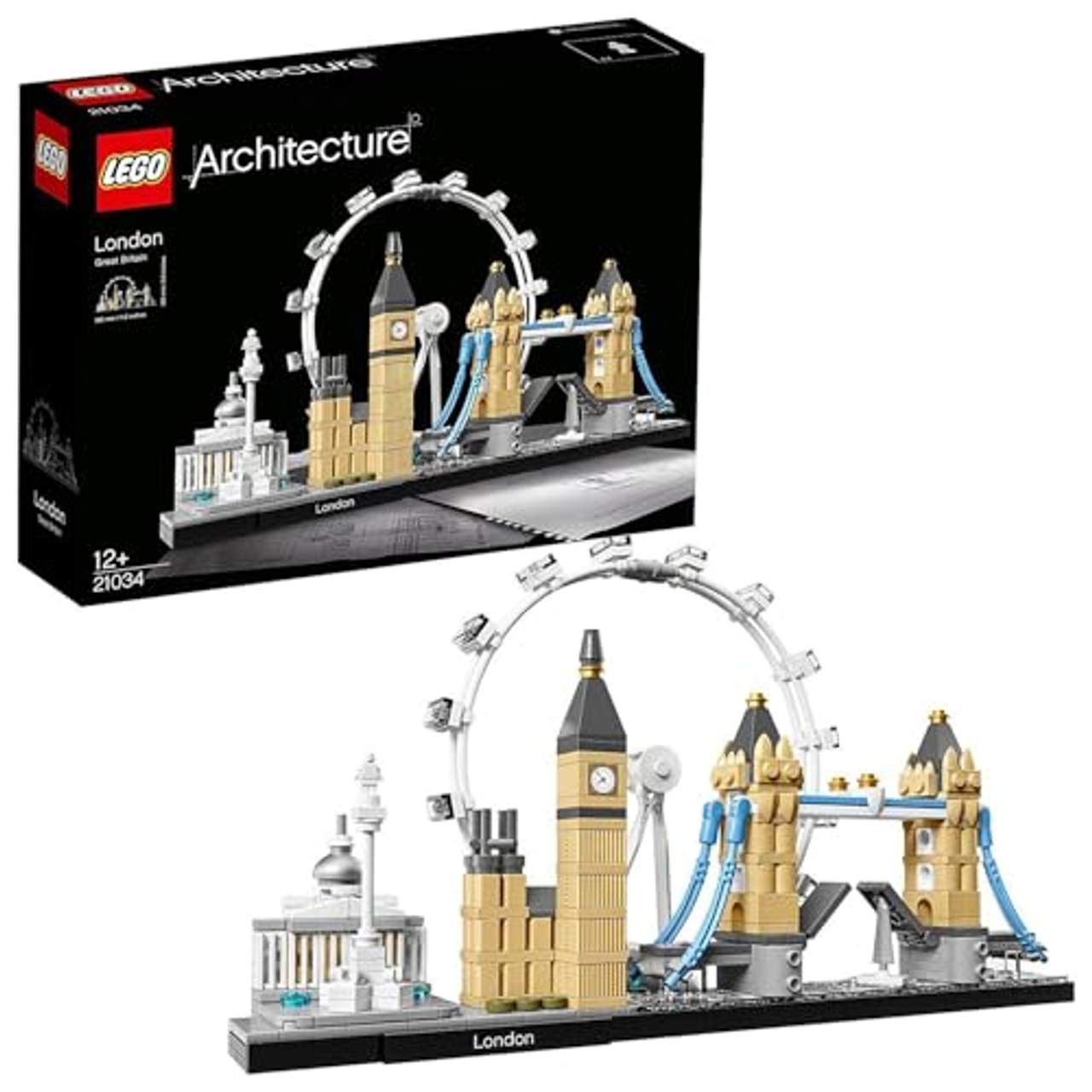 LEGO Architecture 21034 LondonDieses Modell aus der Produktreihe LEGO Architecture Skyline ist eine Hommage an London! Dieses prächtige Model, das die legendären Bauwerke von London – die National Gallery, die Nelsonsäule, das London Eye, Big Ben (offizieller Name: Elizabeth Tower) und die Tower Bridge – zu einer inspirierenden Skyline-Kulisse vereint, spiegelt die für London charakteristische Architektur eindrucksvoll wider. Jedes einzelne LEGO Bauwerk vermittelt ein einzigartiges und besonders lohnenswertes Bauerlebnis. Dafür sorgen auch die originalgetreue Farbgebung und die maßstabsgetreue Nachbildung. Die Themse durch London wird auf der mit Platten besetzten Grundplatte ebenfalls dargestellt, was diesem wunderbaren Modell eine zusätzliche Dimension und noch mehr Authentizität verleiht.Im Vordergrund steht jedoch die architektonische Vielfalt einer der dynamischsten Städte der Welt. LEGO Architecture Interpretation von London. Mit National Gallery, Nelsonsäule, London Eye, Big Ben (offizieller Name: Elizabeth Tower) und Tower Bridge. Die Themse durch London wird mit durchsichtigen Platten auf der Grundplatte dargestellt.Die Tower Bridge öffnet sich, um das ankommende Schiff willkommen zu heißen. Das beiliegende Heft enthält Informationen über den Designer, die Architektur und die Geschichte der einzelnen Bauwerke sowie historische Fakten zu London und dem architektonischen Erbe dieser Metropole (nur in englischer Sprache.Das Heft kann in anderen Sprachen auf LEGO.com/architecture heruntergeladen werden.) Enthält eine mit Platten besetzte 4x32-Grundplatte mit dem dekorativen Namensschild „London“. Mit der Kollektion LEGO Architecture Skyline lassen sich einige der weltweit schönsten Städte nachbilden. Die Produktlinie LEGO Architecture ist eine Hommage an die Welt der Architektur in Form von LEGO Steinen und spricht jeden an, der sich für Reisen, Design, Architektur und Geschichte interessiert Dieses Set enthält mehr als 460 LEGO Teile und bietet Baumeistern ab 12 Jahren ein altersgerechtes Bauerlebnis.Das Modell ist 15 cm hoch, 28 cm breit und 8 cm tief.