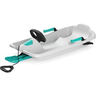 Mit einem Lenkschlitten hast du, dank breiter Kufen, im Tief- oder auf Hartschnee, einen ultimativen, flotten Rodelspaß. Der Lenkschlitten besteht meist aus einer stabilen Metallkonstruktion. Die meist gepolsterte Sitzfläche ist aus strapazierfähigem Kunststoff gefertigt. Er verfügt über drei Kufen, wobei die vordere flexibel über das Lenkrad oder den Lenker, zur Steuerung dient. Es gibt auch Modelle bei denen die vordere Kufe gefedert ist, um Stöße abzumildern. Er hat zudem eine integrierte Bremse. Einige Modell verfügen auch über eine beidseitige Fußbremse, die der optimalen Sicherheit dient. Ein integriertes Zugseil, welches sich bei einigen Modellen sogar automatisch einrollt, wenn es nicht gebraucht wird, rundet den Komfort ab.