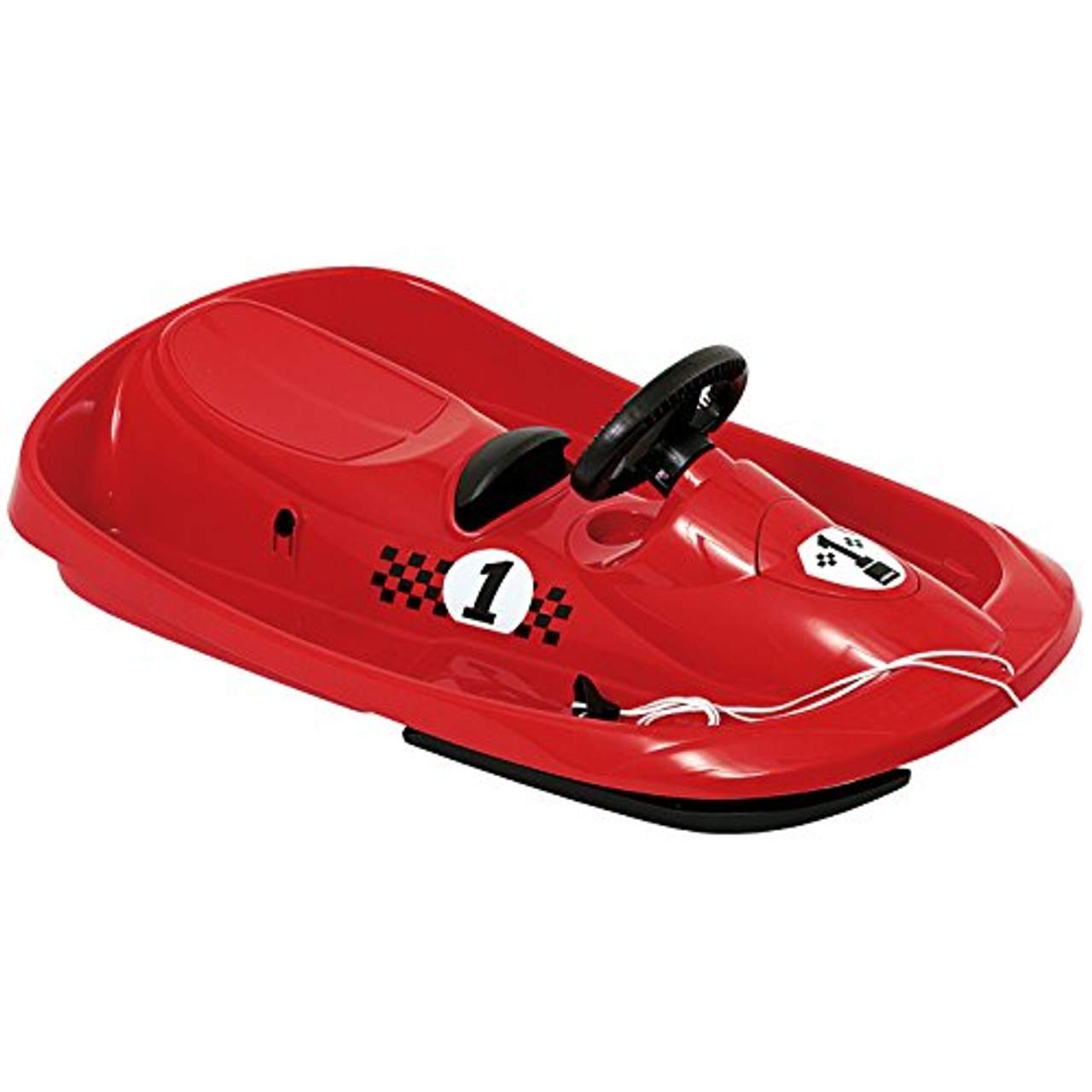 Dieser 1-Personen-Schlitten ist für Kinder ab drei Jahren geeignet. Kleine Rennfahrer können mit ihm allein rodeln. Dieser Schlitten hat eine mit der Hand zu betätigende Metallbremse zur Geschwindigkeitskontrolle und ein Lenkrad zum bequemen Steuern. Mit Seil zum Heraufziehen nach der Abfahrt.