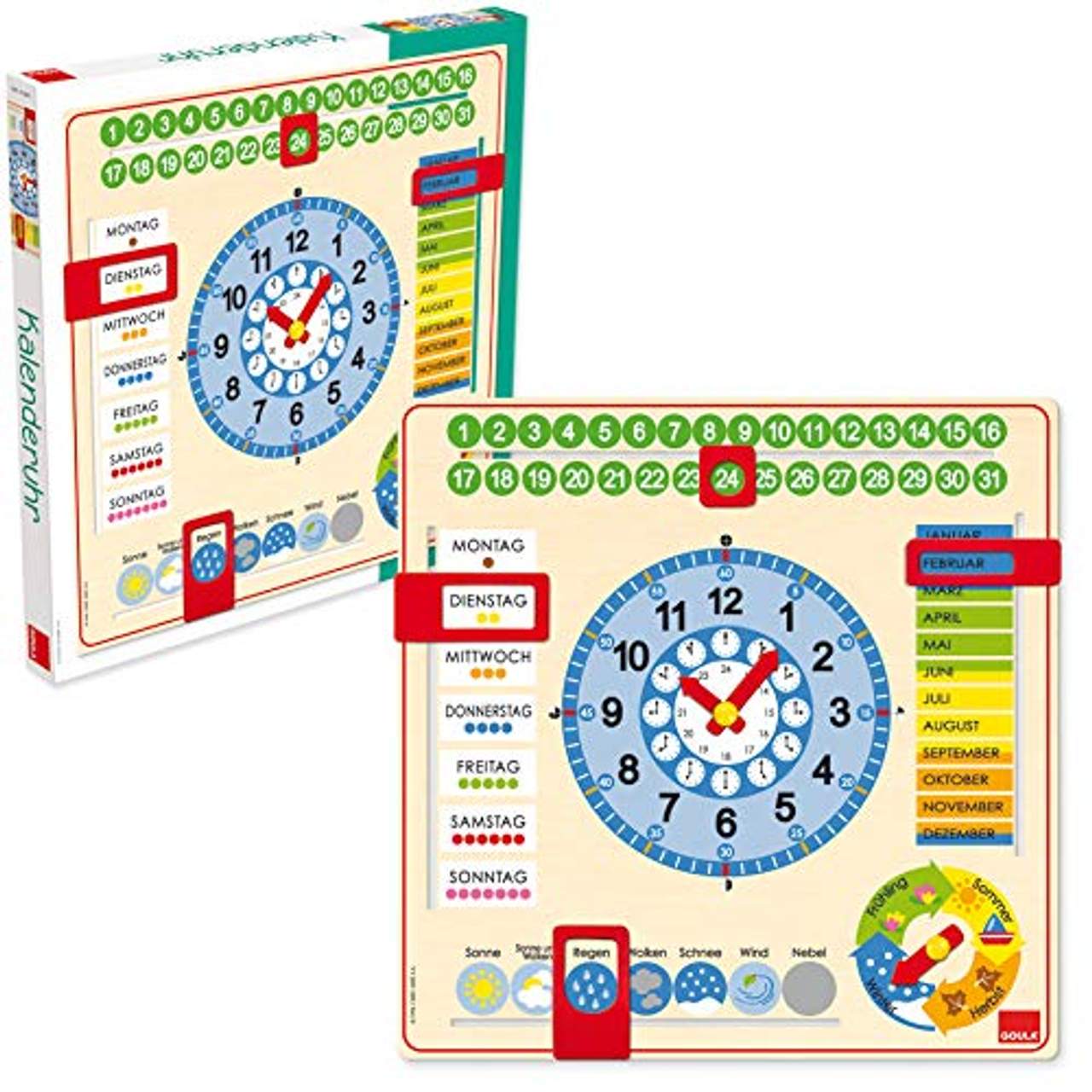 Jumbo Spiele GoulaDie Kalenderuhr zum spielerischen Lernen der Uhrzeit! Diese Kalenderuhr erleichtert das spielerische Lernen der Monate, Jahreszeiten, Tage, Stunden und Minuten. Die Uhr enthält bewegliche Teile, die selbst für kleinere Kinder gut zu nutzen sind. Ein schönes Holz-Lernspielzeug, welches mitwächst vom Kleinkind- bis ins Grundschulalter.+++Details+++ + Maße: 44 x 44 x 2,5 cm + bildet Uhrzeit, (Wochen-)tage, Monate, Jahreszeiten und Wetter ab + Material: Holz + zur Wandbefestigung geeignet ACHTUNG! Dieser Artikel besitzt kein Uhrwerk.