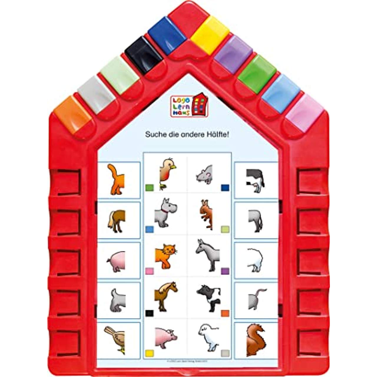 Logo Lernhaus: Set 1 Kinderwissen 3-4 Jahre alte Kinder: Mein ist ein Lernspiel, das Kindern im Alter von 3-4 Jahren helfen soll, Farben, Formen und Zahlen zu lernen. Das Set enthält ein Kontrollgerät (Lernhaus), 24 Aufgabenkarten im Kartenfach, 10 Farbsteine im Dach des Lernhauses. Es fördert die Konzentration und die Wahrnehmung sowie das Denken und die Merkfähigkeit für Mengen und Zahlen. Mit dem Spiel lernen Kinder am besten.