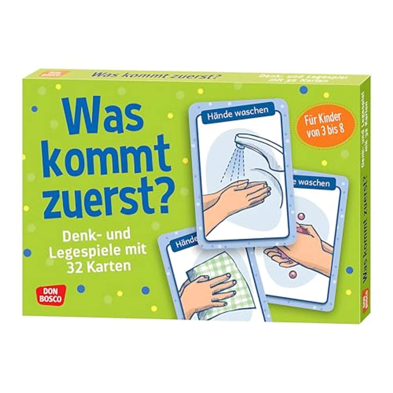 Bei diesem Produkt handelt es sich um das Lernspiel „Was kommt zuerst? : Denk- und Legespiele“, das von der Marke Don Bosco Medien GmbH hergestellt wird. Es besteht aus 32 Karten, die für Kinder im Alter von 3 bis 8 Jahren entwickelt wurden und ihnen helfen, die Abfolge von alltäglichen Aufgaben wie Anziehen oder Händewaschen zu üben. Es gibt 8 Themen mit jeweils 4 Sequenzen, die sich auf das Anziehen, das Malen von Wasserfarben, das Händewaschen, das Abwaschen, das Essen, das Einkaufen, das Überqueren der Straße und das Pflanzen von Pflanzen beziehen. Das Set enthält eine Spielanleitung, verschiedene Spielvarianten und methodische Anregungen.
