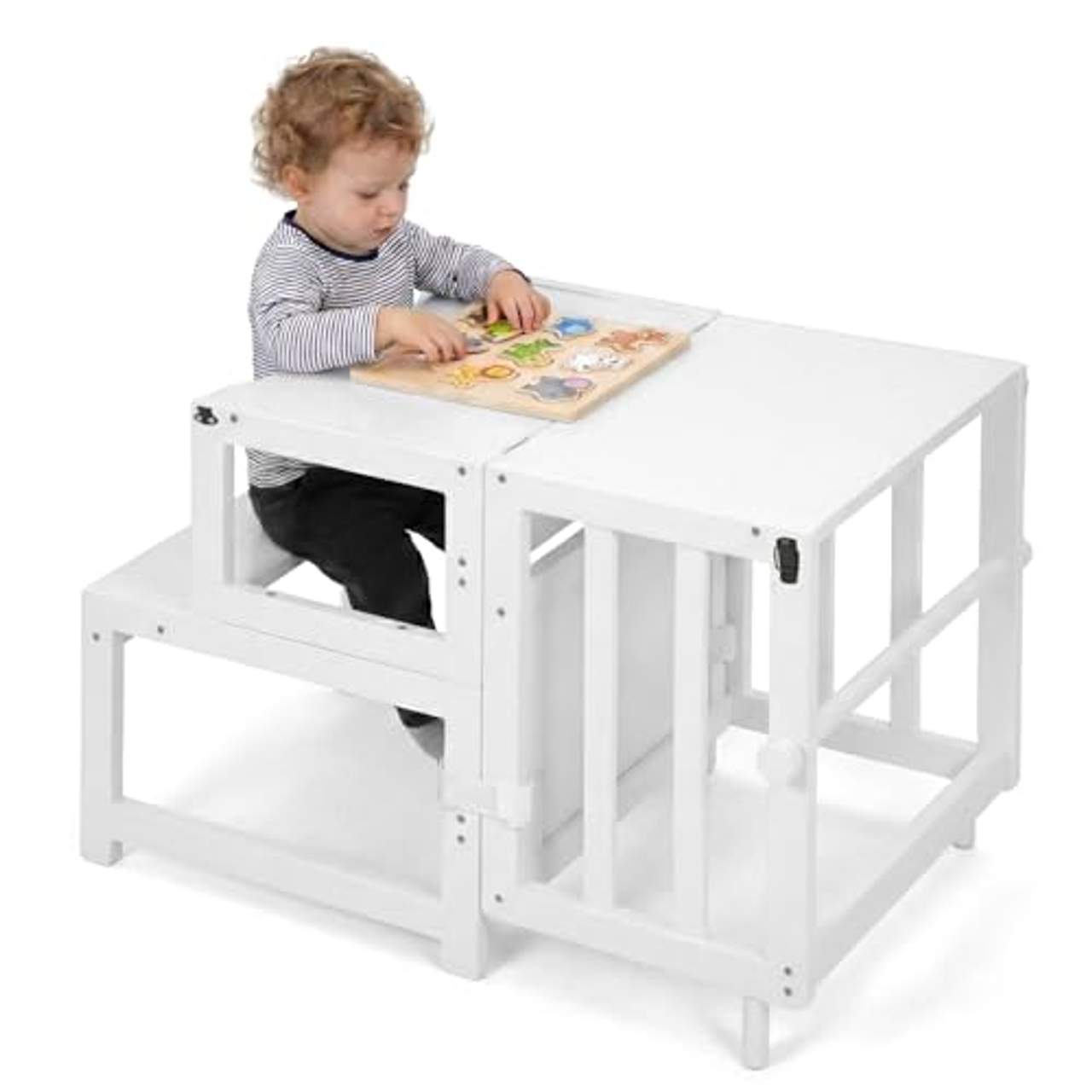 - Vielseitiges Design: Der COSYLAND 3-in-1 Lernturm für Kinder lässt sich dank seines vielseitigen Designs mühelos von einem Küchenhocker in einen Kindertisch verwandeln und enthält sogar ein Whiteboard für kreative Aktivitäten. Diese Multifunktionalität spart nicht nur Platz, sondern bietet Kindern auch verschiedene Lernumgebungen, die sie zu unterschiedlichen Aktivitäten wie Malen, Spielen und Helfen in der Küche anregen. Durch die Möglichkeit, die Funktionen ohne Werkzeug zu wechseln, können Eltern den Turm jederzeit schnell an die Bedürfnisse und Interessen ihres Kindes anpassen und so eine anregende und stimulierende Lern- und Spielatmosphäre schaffen.