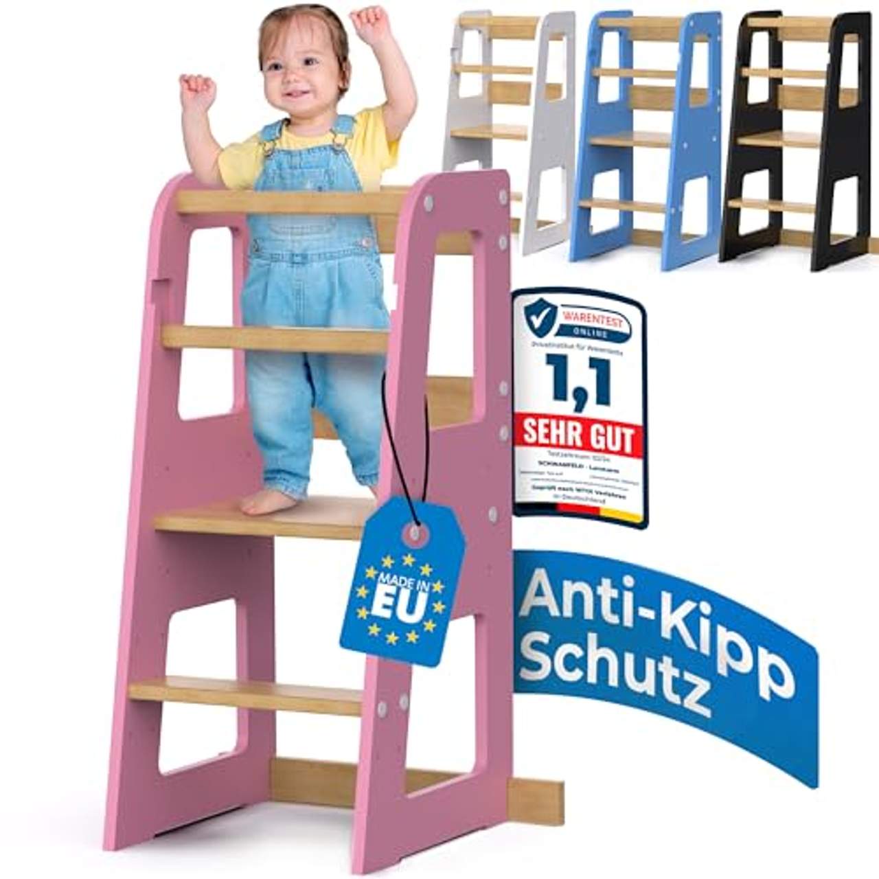 - Höhenverstellbares Design: Eines der herausragenden Merkmale des "Schwanfeld Lernturms ab 1 Jahr" ist sein höhenverstellbares Design, durch das er mit deinem Kind mitwachsen kann. Mit drei verschiedenen Stufen für die Treppe und die Stehplattform passt sich dieser Lernturm an die sich verändernden Bedürfnisse deines Kindes an, wenn es älter wird. Diese Vielseitigkeit bedeutet, dass du im Laufe der Zeit nicht mehrere Produkte kaufen musst, sondern dich auf einen stabilen Turm verlassen kannst, der die Entwicklung deines Kindes mitmacht, was ihn zu einer kostengünstigen Lösung für Familien macht.