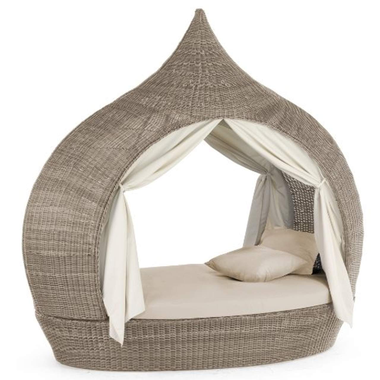 Liegeinsel Eye Catcher Cubu Taupe beidseitig offen LoungeDer Name dieser exklusiven Liegeinsel spricht für sich,denn der Eye Catcher von Domus Ventures bietet ein imposantes Platzangebot bei absolutem Komfort. Seine orientalisch anmutende Form schafft luxuriösen Platz für bis zu 2 Personen. Die außergewöhnlich naturgetreue Haptik wird anhand aufgerauter oder geprägter Oberflächen mittels speziellem Musterwalzen-Verfahren erreicht.Die robusten Rahmen sind aus hochwertigem Aluminium,welches passend zur Geflechtfarbe pulverbeschichtet wird. Die Schrauben und Beschläge sind aus erstklassigem,rostfreiem UVA-Stahl.Das Geflecht ist aus der AbacoXF Outdoor Faser von Facharbeitern aufwändig manuell geflochten. Das Gewebe ist aus hochdichtem Polyethylen hergestellt und extra für robuste Möbel für den Außenbereich entwickelt worden.So ist die Garnitur absolut wetterfest,schmutzabweisend und daher einfach zu reinigen,UV-Lichtbeständig und umweltfreundlich da recycelbar. Zudem verträgt sie Frost bis zu -15°C und ist verschleiß-und reißfest.Das Gestell der Liegeinsel kann bei jedem Wetter, ganzjährig in Freien stehen. Da der Hersteller bei jedem Produkt einen ausführlichen Qualitätscheck macht,ist eine makellose Verarbeitung gesichert.Wir empfehlen die Polster und Kissen im Winter oder bei starker Luftfeuchtigkeit trocken zu lagern. Dies gilt ebenfalls während des Schutzes mit Abdeckhaube,da Schwitzwasser unter der Haube Stockflecken verursachen kann und das Material dadurch strapaziert wird.Bei gängiger Verschmutzung der Bezüge können diese einfach vom Schaumkern getrennt und in der Waschmaschine bei max. 30°C gereinigt werden.Im Lieferumfang enthalten sind das Gestell der Eye Catcher Liegeinsel,1 passende Auflage und 4 Wellness-Kissen, Vorhänge.Die Eye Catcher-Liegeinsel ist in vielen weiteren unterschiedlichen Farben und Designs in unserem Online-Shop erhältlich.Maße:Höhe:ca. 215 cm, Tiefe:ca. 127 cm, Breite:ca. 230 cm, Sitzhöhe:ca. 44 cm (mit Polster)