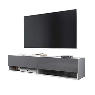 Der Selsey Wander TV-Lowboard Fernsehschrank Hängend ist aus strapazierfähigem, laminiertem Plattenmaterial gefertigt, das eine lange Lebensdauer garantiert. Die graue Frontplatte hat eine beeindruckende Hochglanzoberfläche, während die anderen Oberflächen eine matte Textur aufweisen. Diese Kombination von Texturen macht das Lowboard optisch interessant und steigert die Ästhetik des Schranks.
