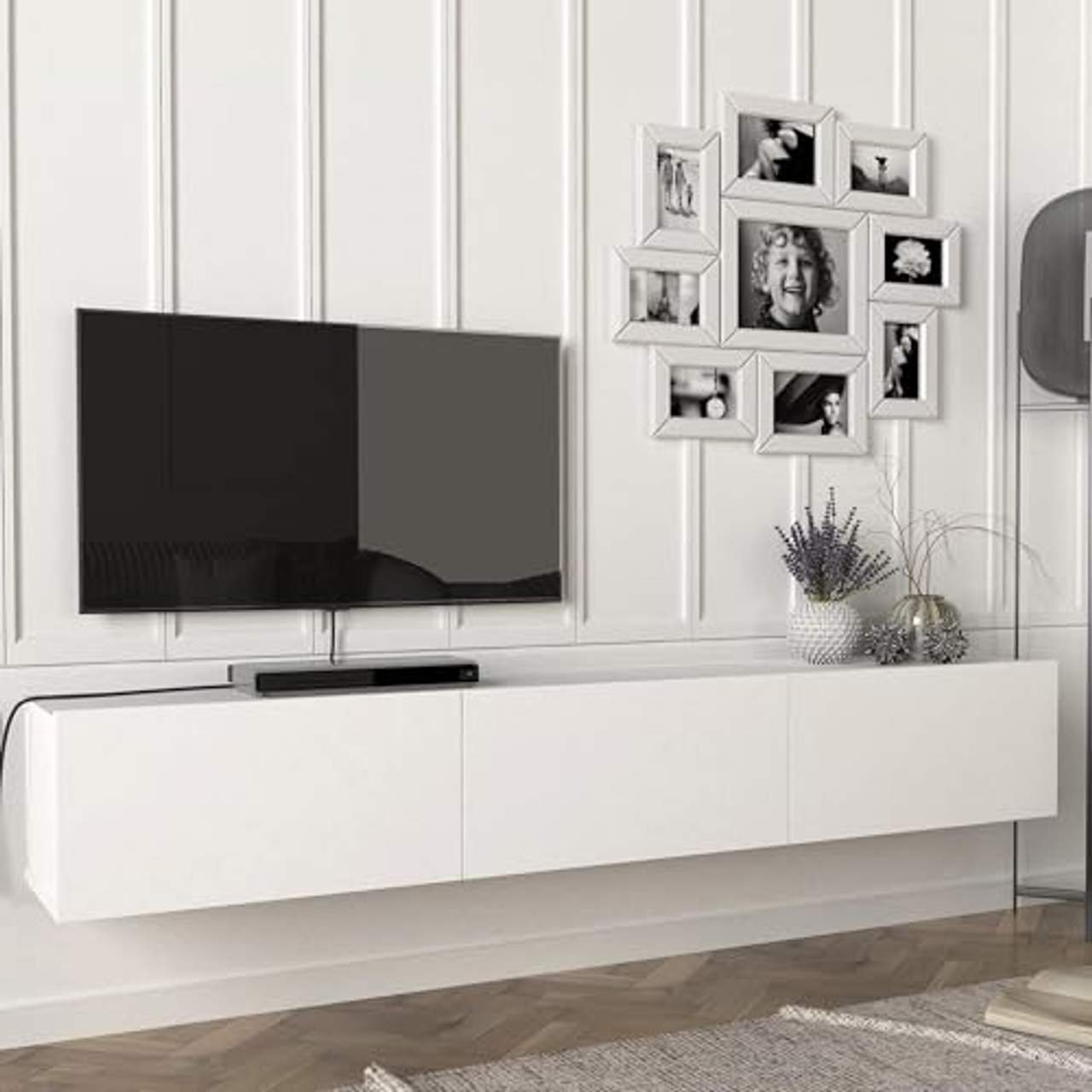 Lowboard Vihti mit 3 StaufächernTV SchrankUnser schwebender Fernsehtisch lässt sich einfach und unkompliziert an der Wand montieren und ist mit seinem modernen Design und dem praktischen Stauraum im Inneren eine elegante Ergänzung für Ihr Wohnzimmer oder Ihre Unterhaltungsecke.Er verfügt über drei Fächer, die sich durch die Türen separat √∂ffnen lassen. Die Fächer bieten ausreichend Platz für die Aufbewahrung Ihrer Mediengeräte, DVDs, Spiele und anderer Unterhaltungsutensilien.Mit dem TV-Lowboard können Sie Ihren Raum optimal nutzen und gleichzeitig Ihre Gegenstände ordentlich und geschützt aufbewahren. Die klare und moderne Gestaltung fügt sich nahtlos in Ihre Einrichtung ein und verleiht Ihrem Wohnzimmer ein ansprechendes Ambiente.Nutzen Sie den Platz an Ihrer Wand optimal und genießen Sie gleichzeitig die Funktionalität und den Komfort, den dieser stilvolle Fernsehtisch bietet.Produkt-Highlights:- Modernes und schwebendes TV-Lowboard für Ihren Wohnraum - 3 Staufächer mit Türen für Ihre Unterhaltungsutensilien - Einfache Wandmontage für maximale Flexibilität - Platzsparend und pflegeleicht - Belastbar bis zu 36 kgMaße:- Gesamt (LxBxH): 180 x 31 x 29,5 cm - Innenmaße Ablagefach (LxBxH): je 57,5 x 29,5 x 25 cm - Türfront (LxH): je 60 x 29,5 cm - Korpushöhe: 28,5 cmMaterial:18 mm SpanplatteFarbe:WeißLieferumfang:1 x TV-Wandelement inkl. MontagematerialMarkenware aus dem Hause:[en.casa]