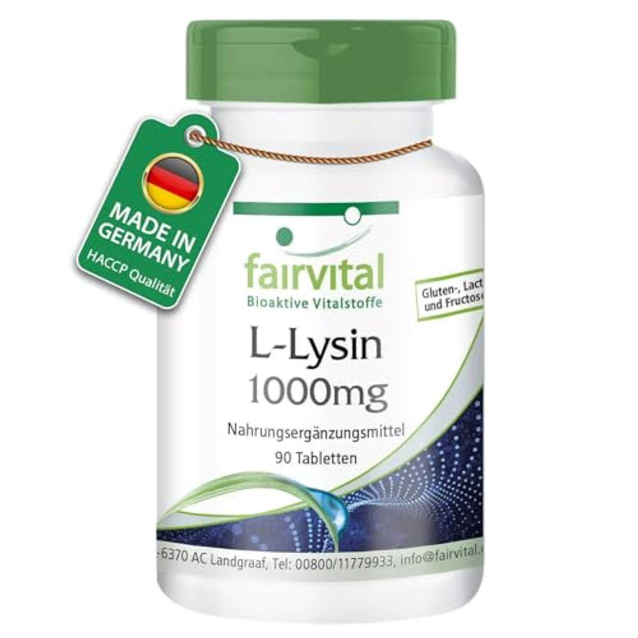 Fairvital Lysin hochdosiert ist eine deutsche Qualitäts-Lysintablette. Sie enthält 1250 mg L-Lysinhydrochlorid, mit 1000 mg L-Lysin pro Tagesdosis. Sie enthält kein Gluten, keine Laktose, keine Fruktose, kein Magnesiumstearat, kein Siliciumdioxid, keine Konservierungsstoffe, kein Soja, keine Hefe, keine Pestizide, keine Fungizide, keine künstlichen Düngemittel, keine Farbstoffe, keine Stabilisatoren und keine Gentechnik (NON-GMO). Es wird in einer luftdicht verschlossenen Dose mit 90 Tabletten geliefert. Dieses Produkt wird in Deutschland mit Rohstoffen aus EU- und Nicht-EU-Ländern hergestellt und hat eine 24-monatige Geld-zurück-Garantie. Die wichtigsten Merkmale sind: Hohe Dosierung; ausgezeichnetes Preis-Leistungs-Verhältnis; mikrobielle Reinheit; 3 Monate Vorrat; leichte Dose mit praktischem Dosierdeckel.