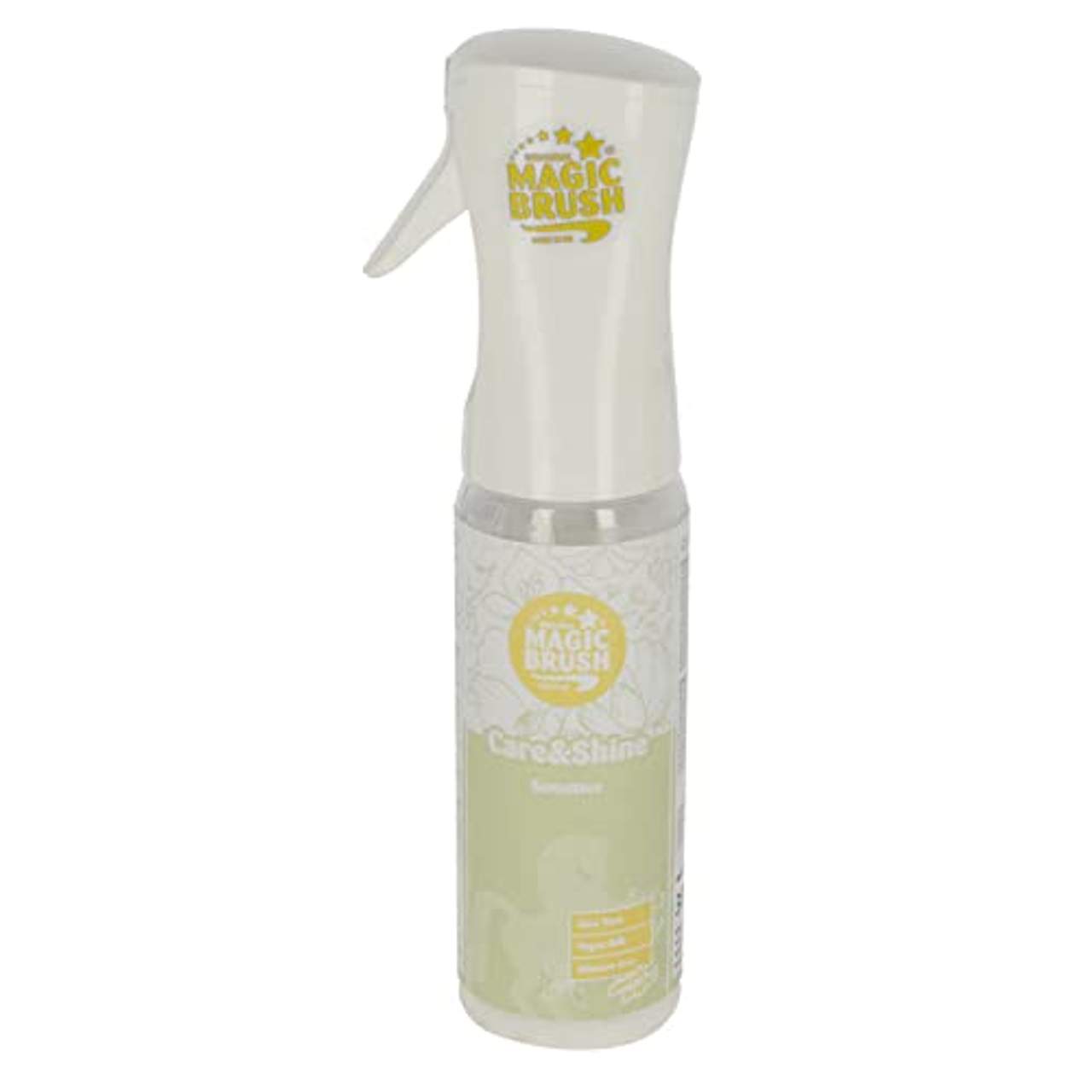 Magic Brush37901000-02 Care&Shine Pflegespray 300mlBesondere Eigenschaften: * Für jedes Pferdehaar geeignet * Vereinfacht das Bürsten, löst Verknotungen * Pflegt das Pferdehaar und verleiht einen natürlichen seidigen Glanz * Wirkt staub- und schmutzabweisend * Enthält pflegenden Vitamin B-Komplex, der Kraft gibt und die Durchblutung fördert * Zusätzliches Vitamin B6 beugt Entzündungen vor und sorgt für gesunde Haut * Frei von Silikonen * 360° Sprühflasche: für eine einfache und effiziente Anwendung * Besonders leises Sprühgeräusch und extra feiner Sprühnebel * Bei sensiblen Pferden einsetzbar * Geringer Verbrauch durch neue Sprühkopftechnologie Care&Shine Fruit Surprise - mit fruchtig frischem Waldbeerenduft für extra seidigen Glanz * 100 % natürliche Inhaltsstoffe: Blaubeer- und Himbeeröl, Macadamianussöl, Rizinusöl Care&Shine Sensitive - Aloe Vera Extrakt: spendet Feuchtigkeit und sorgt für gesundes Haar mit natürlichem Glanz * 100 % natürliche Inhaltsstoffe: Aloe Vera, Macadamianussöl, Rizinusöl