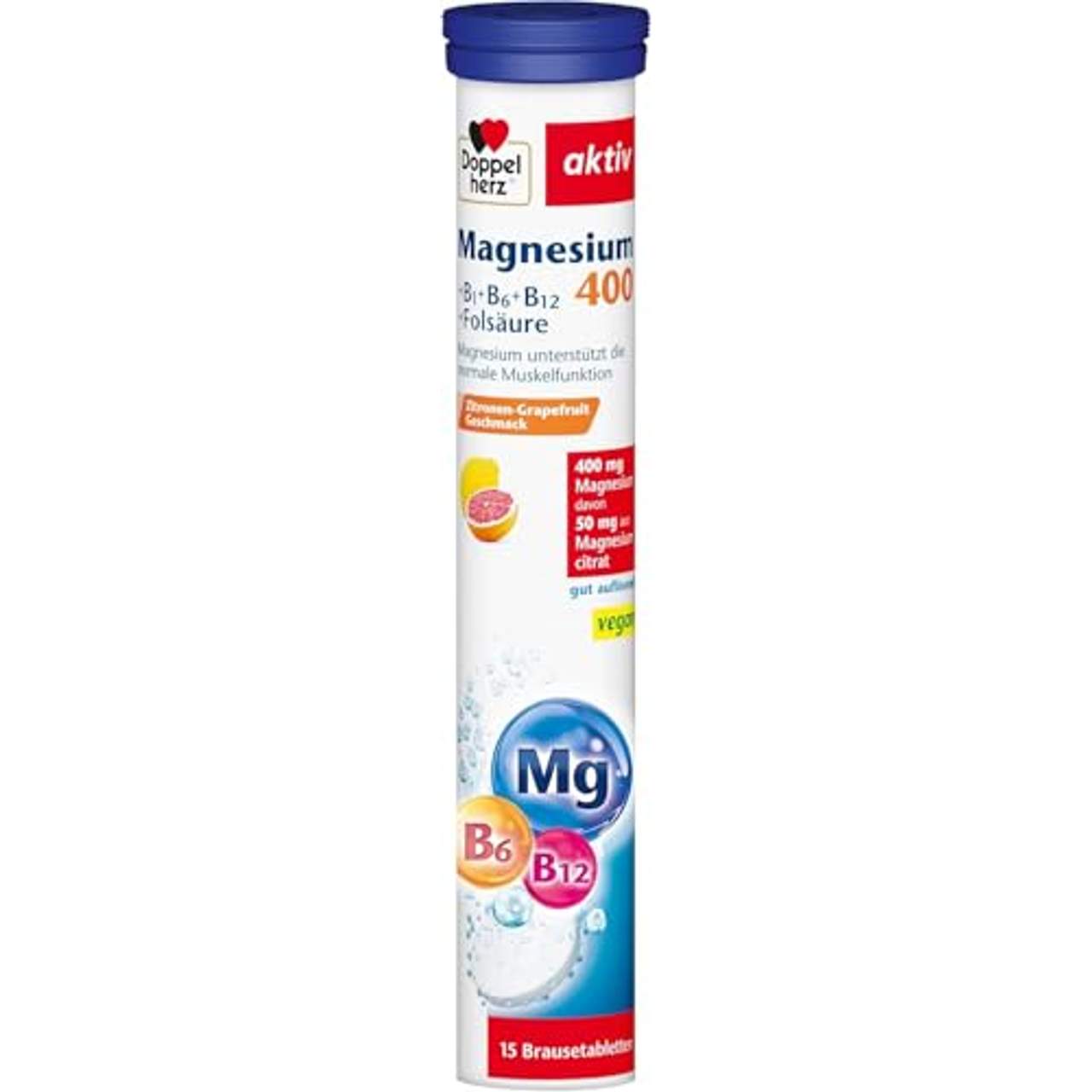 Doppelherz Magnesium 400 BrausetablettenNahrungsergänzungsmittel sind kein Ersatz für eine ausgewogene und abwechslungsreiche Ernährung und eine gesunde Lebensweise. Doppelherz aktiv Magnesium 400 + B1 + B6 + B12 + Folsäure Brausetabletten 400 mg Magnesium zur Unterstützung des normalen Energiestoffwechsels und der Muskelfunktion Vitamin B1 trägt zur normalen Herzfunktion bei Gut auflösende Brausetablette mit frischem Zitronen-Geschmack Eine optimale Versorgung mit Vitaminen und Mineralstoffen ist eine wichtige Voraussetzung für das Wohlbefinden und die Leistungsfähigkeit unseres Körpers.Magnesium ist ein lebensnotwendiger Mineralstoff, den der Körper nicht selber bilden kann. Außerdem ist eine Speicherung nur in begrenztem Umfang möglich. Die Brausetabletten von Doppelherz enthalten neben 400 mg Magnesium - 50 mg Magnesium in Form von Magnesiumcitrat - ausgewählte B-Vitamine, einschließlich der Folsäure. Für die normale Funktion des Nervensystems spielen die Vitamine B1, B6 und B12 eine Rolle. Folsäure hat eine Funktion bei der Zellteilung und leistet einen Beitrag zur normalen Blutbildung. Eine Nahrungsergänzung mit Doppelherz Magnesium 400+B1+B6+B12+Folsäure Brausetabletten empfiehlt sich bei unausgewogener Ernährung oder einem erhöhten Nährstoffbedarf. Zutaten : Säuerungsmittel Citronensäure, Magnesiumcarbonat, Säureregulatoren Natriumhydrogencarbonat und Natriumcarbonat, Trimagnesiumdicitrat, Süßungsmittel Natriumcyclamat und Natriumsaccharin, Aroma, Stärke, Vitamin B6, Vitamin B1, Folsäure, Farbstoff Riboflavin-5’-Phosphat, Vitamin B12 Nährwerte eine Brausetablette enthält % Nrv* Magnesium 400 mg 107 % Folsäure 600 μg 300 % Vitamin B1 1,1 mg 100 % Vitamin B6 4,2 mg 300 % Vitamin B12 5,0 μg 200 % * Nährstoffbezugswerte gemäß EU-Verordnung 1169/2011 Verzehrsempfehlung: 1 Tablette täglich in einem Glas Wasser (200 ml) aufgelöst trinken. Hinweis: Die angegebene empfohlene Tagesmenge darf nicht überschritten werden. Aufbewahrung: Kühl (6-25 °C) und lichtgeschützt lagern. Außerhalb der Reichweite von Kindern aufbewahren. Nettofüllmenge: 15 Tabletten = 97,5 g Herstellerdaten: Queisser Pharma GmbH & Co. KG Schleswiger Str. 74 24941 Flensburg