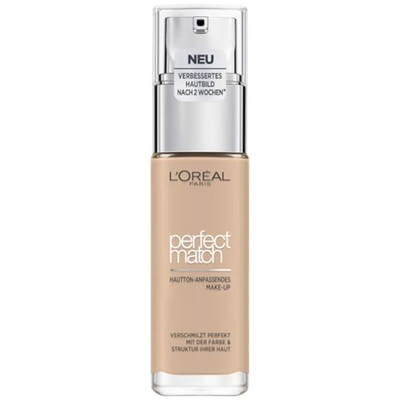 L'Oréal Paris Make up Flüssige FoundationDas Perfect Match Make-up von L?Oréal Paris ist Pflege, Schutz und Foundation in einem. Das flüssige Make-up zaubert einen ebenmäßigen und natürlichen Teint im optimalen Farbton. Zusätzlich pflegt und schützt die Formel mit Hyaluron und Aloe Vera die Haut und verbessert das Hautbild.Dank der innovativen Micro-Match-Technologie der Foundation verschmilzt die ultra-leichte Textur mit der Haut. Die Foundation optimiert optisch sowohl den Hautton als auch die Hautstruktur. Das feuchtigkeitsspendende Make-up von L’Oréal Paris fühlt sich wunderbar geschmeidig an und passt sich Ihrem Hautunterton an - für einen absolut natürlich und ebenmäßig wirkenden Teint ohne Maskeneffekt. Anwendung: Einen Tropfen L’Oréal Paris Perfect Match Make-up von innen nach außen gleichmäßig auf das Gesicht auftragen. Erst mit einer kleinen Menge der Foundation beginnen, etwa 1-2 Tropfen, bei Bedarf - z. B. wenn die Menge nicht für eine gleichmäßige Schicht ausreicht oder um die Deckkraft aufzubauen - noch etwas mehr von der Foundation verwenden. Damit das Gesamtergebnis natürlich wirkt, die Foundation anschließend gut verblenden.