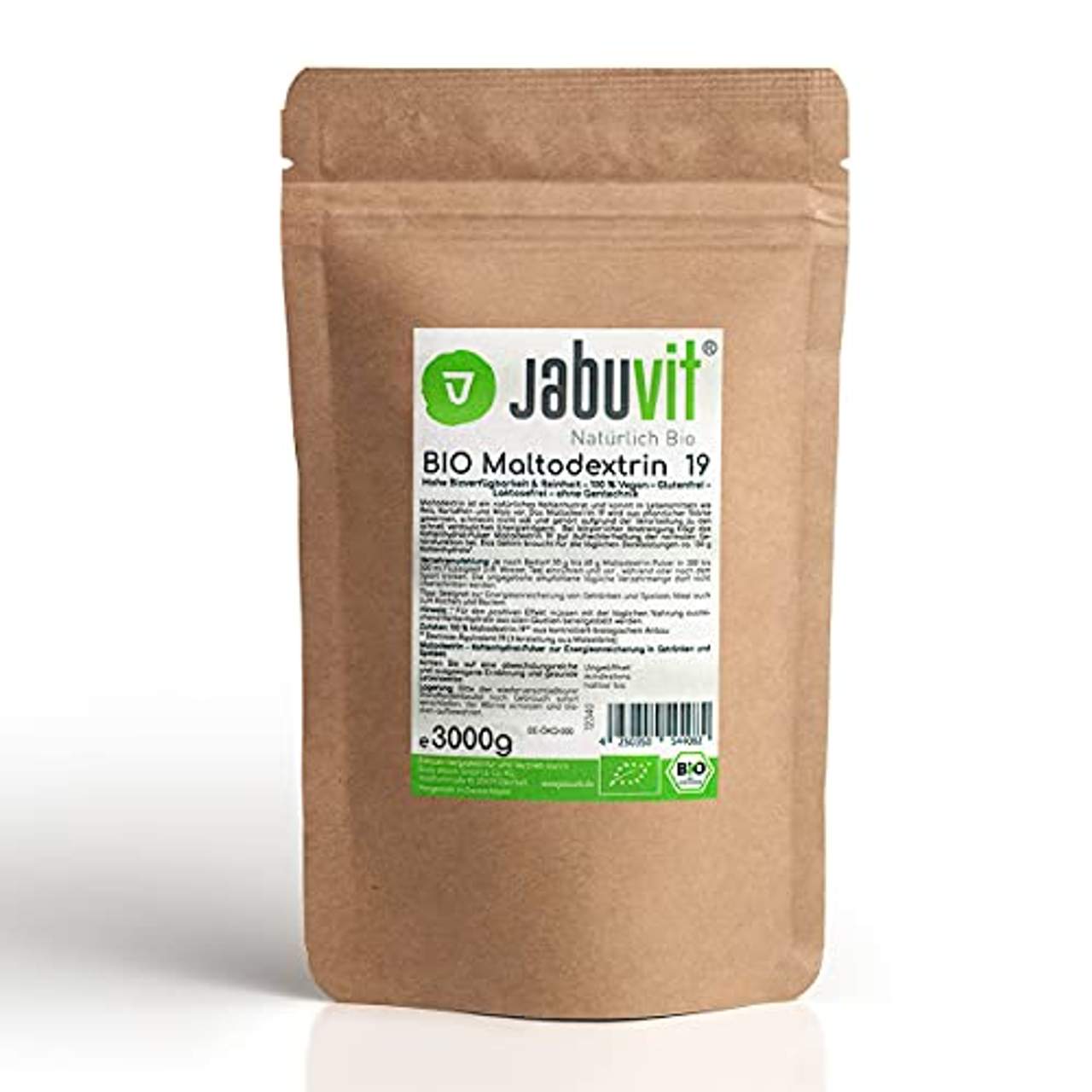 Jabuvit JabuVit-BIO Maltodextrin 19BIO MALTODEXTRIN 19- in der höchsten Qualität. Das biologisch zertifizierte Maltodextrin von JabuVit eignet sich hervorragend zum Verfeinern gesunder Gerichte oder köstlicher Getränke. Versorge deinen Körper mit einem komplexen Kohlenhydratprofil in höchster Bioverfügbarkeit. HOCHWERTIGE BIO KOHLENHYDRATE- in jeder einzelnen Portion.Unser BIO Maltodextrin besitzt einen hohen Gehalt an wertvollen, natürlichen und schnellen Kohlenhydraten und ist somit die ideale Ergänzung zu jeder gesunden Mahlzeit. Starte mit der nötigen Energie in den Tag und überbrücke auf gesunde Weise jedes Energieloch.LEICHTE VERTRÄGLICHKEIT- dank der zusatzfreien Premium Qualität. Vegan passt es sowohl in die vegane als auch in eine gesundheitsbewusste Lebensweise und ist dank Bio-Qualität besonders gut bekömmlich. Mit 3000g BIO Maltodextrin 19 pro Kraftpapierbeutel profitierst du zudem lange von dessen Genuss.WERTVOLLER KUNSTSTOFFVERZICHT- aus voller Überzeugung. Wir verwenden für unser BIO Maltodextrin 19 ausdrücklich die umweltschonende Kraftpapierverpackung. So bleibt nicht nur unser Maltodextrin Pulver, sondern auch Mutter Natur weiterhin unberührt von jeglicher Umweltbelastung. NATÜRLICH BIO: Natürlich JabuVit- gesund, nachhaltig und lecker genießen war noch nie einfacher.Aus Liebe zum Kunden verwenden wir nur die hochwertigsten BIO Rohstoffe, denn dein Wohlbefinden liegt uns ganz besonders am Herzen. Hergestellt unter höchsten Qualitätsanforderungen in Deutschland.
