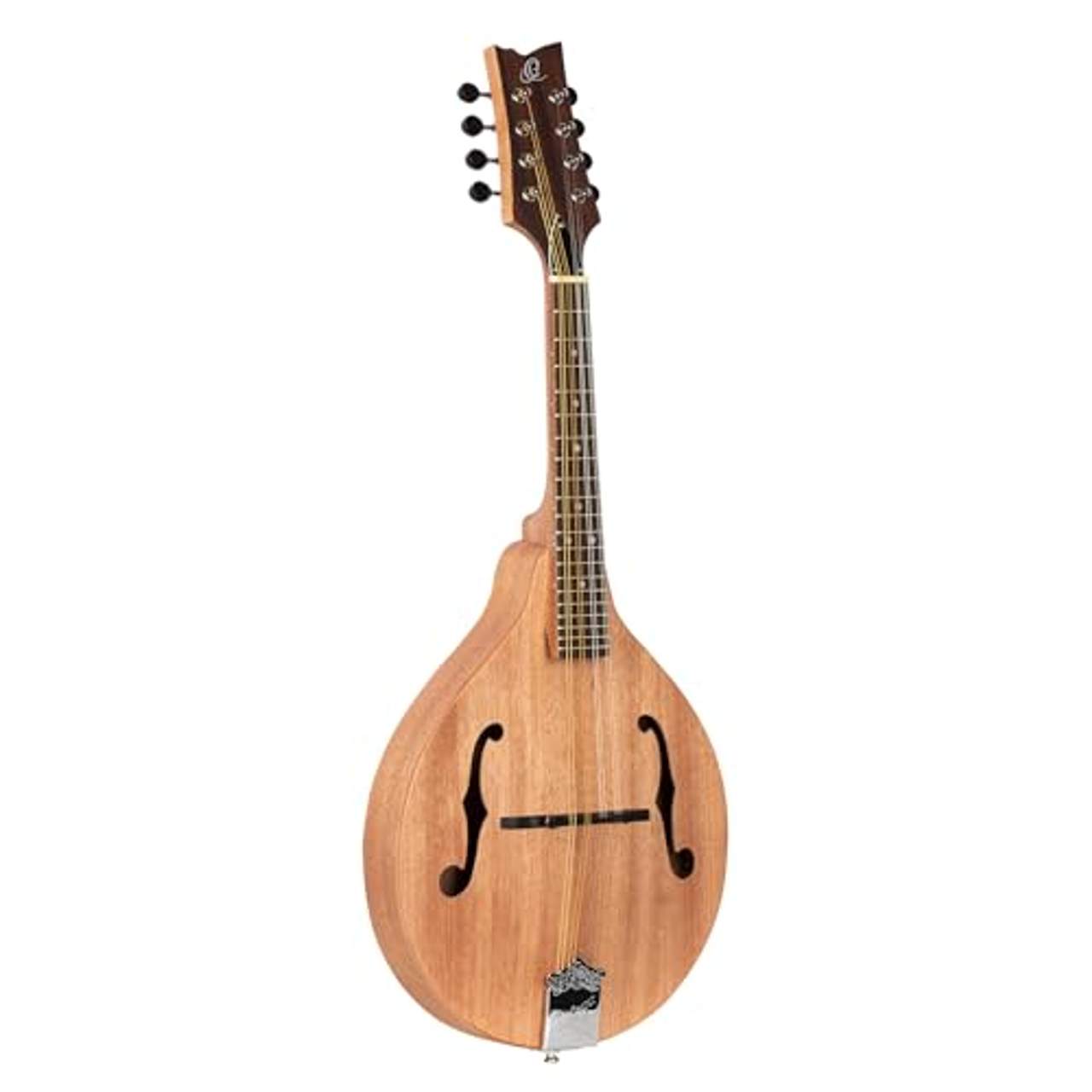 Die Ortega RMA5NA Natural Mandoline ist eine Mandoline im A-Stil mit F-Löchern und einer gewölbten Decke und einem Korpus aus laminiertem Mahagoni. Sie hat einen Mahagoni-Hals mit einem Jatoba-Griffbrett, 20 Bünde und einen verstellbaren Palisander-Steg. Sie verfügt über verchromte Mechaniken mit offenem Getriebe und eine offenporige Lackierung. Sie ist mit 8 Stahlsaiten bestückt und erzeugt einen warmen Klang mit ausgeprägten Mittenfrequenzen.