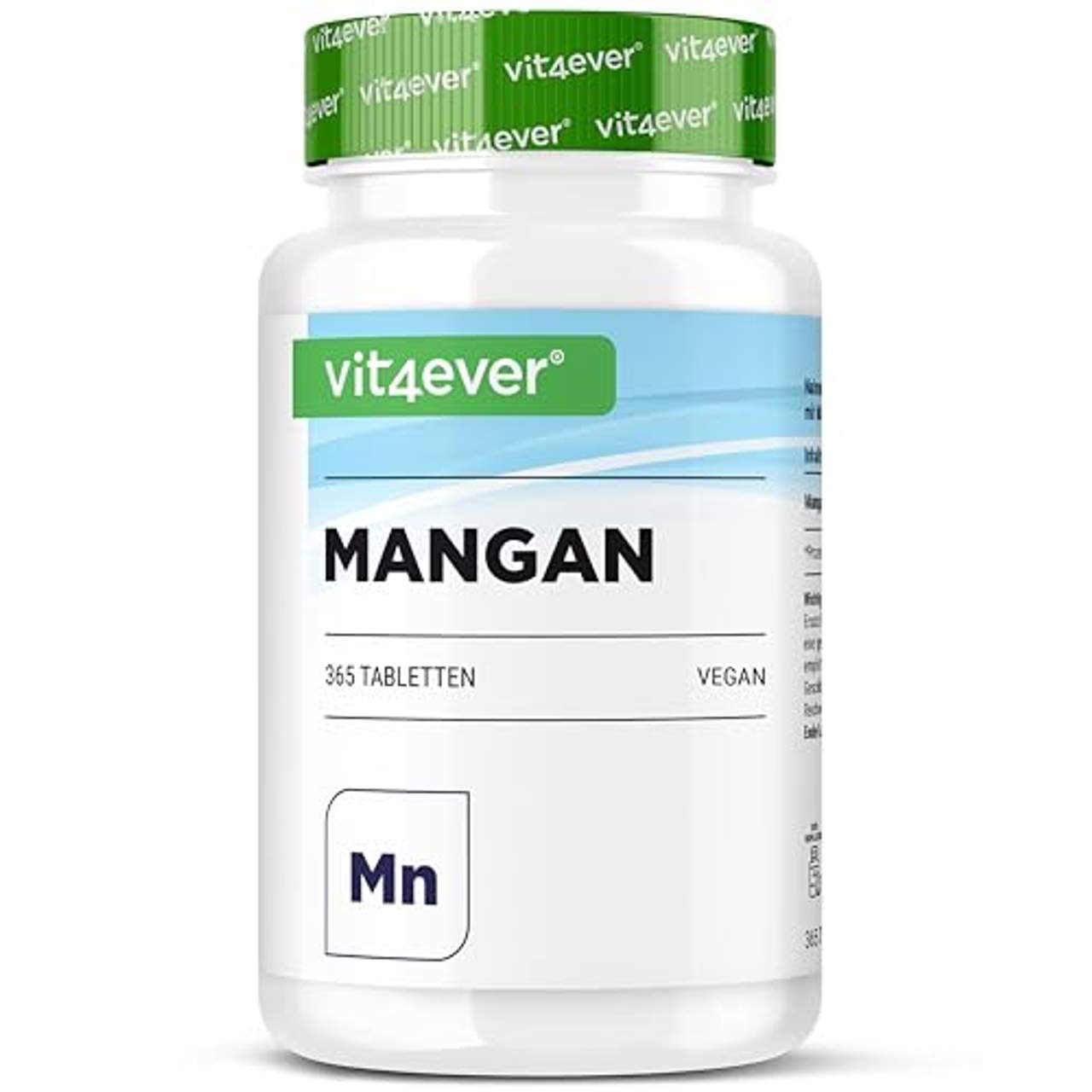 vit4ever Mangan 10 mg 365 TablettenWas ist Mangan Mangan ist ein chemisches Element mit dem Elementsymbol Mn und ähnelt in seinen Eigenschaften sehr dem Eisen. Es zählt zu den essentiellen Spurenelementen und ist Bestandteil verschiedener Enzyme im Körper. Obwohl dieses Spurenelement eines der wichtigsten in unserem Köper darstellt, ist es nur in sehr geringen Mengen in unserem Körper vorhanden und davon zu 40% an die Knochen gebunden.Unser Körper benötigt Magan für folgende Tätigkeiten: die Bildung des Energielieferanten Glukose den Aufbau der Knochen die Aktivierung von Enzymen die Bildung des Neurotransmitters Dopamin Zudem ist Mangan verantwortlich für die Steuerung der Zellenergie in unserem Körper und ist somit selber ein Teil unserer Enzyme.Highlights auf einen Blick: In jeder Dose befinden sich 365 Mangan Tabletten im praktische 8 Monatsvorrat. Jede Tablette ist hochdosiert mit 10 mg vom essentiellen Spurenelement Mangan Manganbisglycinat ist eine Verbindung von Mangan mit Glycin. Glycin hat die kleinste Molekülgröße unter den Aminosäruen und kann somit effektiv durch die Darmwand vom Körper aufgenommen werden.Die Verbindung aus Mangan und Glycin (Mangan Bisglycinat) ist dadurch sehr gut bioverfügbar und kann vom Körper optimal resorbiert werden Mangan Bisglycinat gehört zu den am besten verträglichen Manganverbindungen & ist deshalb auch für Personen mit einem empfindlichen Magen geeignet. Die Tabletten sind ca. 11 mm groß & lassen sich angenehm mit Flüssigkeit verzehren Unsere Mangan Tabletten enthalten keine unerwünschten Zusätze & sind zu 100% Vegan. Die Kapseln sind frei von Magnesiumstearat, Aromen, Farbstoffen, Stabilisatoren, Gelatine und selbstverständlich auch GMO-frei, laktosefrei, glutenfrei & ohne Konservierungsstoffe Mangan ist nicht gleich Mangan! Unser Körper ist leider nicht in der Lage alles an Mangan aufzunehmen, welches sich in der Nahrung befindet, da u.a. Stoffe wie Kalzium, Phosphat und Eisen die Aufnahme mindern oder blockieren können und, oder die bereitgestellte Manganquelle nicht aufnahmefähig genug ist.Glycin ist. Glycin hat die kleinste Molekülgröße unter den Aminosäruen und kann somit effektiv durch die Darmwand vom Körper aufgenommen werden. Die Verbindung aus Mangan und Glycin (Mangan Bisglycinat) ist dadurch sehr gut bioverfügbar und kann vom Körper optimal resorbiert werden.Die Tabletten sind ca. 11 mm groß & lassen sich angenehm mit Flüssigkeit verzehren. Jede Tablette enthält 10 mg elementares Mangan. Gemäß Verzehrempfehlung wird täglich 1 Tablette empfohlen, somit reicht eine Dose für 12 Monate aus. Vit4ever Qualität Bei Vit4ever hat Qualität absolute Priorität, aus diesem Grund verwenden wir ausschließlich hochwertiges Mangan Bisglycinat, welches sehr gut verträglich ist. Mangan Bisglycinat gehört zu den am besten verträglichen Manganverbindungen & ist deshalb auch für Personen mit einem empfindlichen Magen geeignet. Produkteigenschaften: 100% vegan Glutenfrei Laktosefrei Gelatinefrei GMO-Frei Ohne Magnesiumstearat