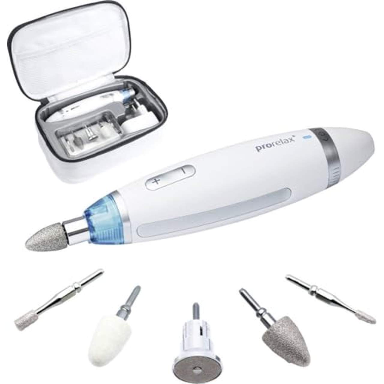 prorelax Maniküre-Pediküre-Set Perfect DamenManiküre-Pediküre-Set für Damen und Herren. Zum perfekten Pflegen, Kürzen und Formen der Nägel. Entfernt Hornhaut, Schwielen, Hühneraugen, Hyperkeratose. Kraftvoller Mikro-Motor mit leisem Rechts- und Linkslauf. Stufenlose Geschwindigkeitsregelung. Für Diabetiker geeignet. Mit Alkohol sterilisierbar. Das Auswechseln der Zubehörteile ist leicht, da das Gerät eine automatische Steckverbindung hat.Filzkegel: Poliert hervorstehende Nagelteilchen weg, zusätzlich werden die Nägel massiert. Saphirkegel feinkörnig: Wegschleifen der harten Haut um Dornwarzen und Hühneraugen. Saphirscheibe feinkörnig: Kürzung und Formung von Finger- und Fußnägeln, durch regelmäßige Anwendung werden die Nägel härter und brechen weniger.Flammenfräser: Entfernung von abgestorbener Haut auf der Nagelseite, vor allem an den Zehen. Zylinderfräser: Abfeilen der dicken Zehennagel-Oberfläche. Dazu bietet das Gerät einen zuverlässigen Staubschutz, der Hautreste und Nagelstaub auffängt. Praktische Transportasche mit Reißverschluss.
