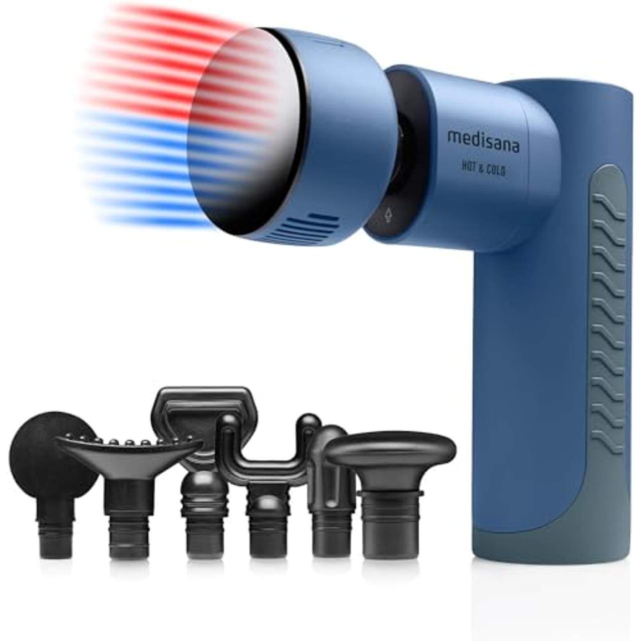 medisana MG 600 Massagepistole Elektrisches MassagegerätHot & Cold Funktion dank Peltier-Technologie Die Hot&Cold Funktion der Massage Gun MG 600 von medisana ermöglicht schnelles und effektives Kühlen oder Wärmen beanspruchter Muskeln. Sie kann sowohl vor dem Training eingesetzt werden, wo sie durch Massage und der 'Hot-Funktion“ Muskelzerrungen präventiv entgegenwirkt, als auch nach dem Training mit der 'Cold-Funktion“, die der Muskelentspannung dient und das Verletzungsrisiko verringert. Die Massage mit 'Hot-Funktion“ wirkt zusätzlich muskulärer Übersäuerung und Entzündungen entgegen. Selbstmassage an verschiedenen Körperstellen Erleben Sie die entspannende Tiefengewebsmassage zur Muskelaktivierung und Förderung der Muskelregeneration mit der medisana Massage Gun MG 600. Sie lässt sich ganz unkompliziert zur Selbstmassage an verschiedenen Körperstellen wie etwa Schulter-, Brust- und Rückenmuskeln sowie Gesäß-, Oberschenkel- oder Wadenmuskeln einsetzen.Muskelermüdung und Muskelkater gehören der Vergangenheit an. Für die tiefe Muskelstimulation sorgen bei der Anwendung drei leistungsstarke Vibrationsstufen. Perfekt für zu Hause, auf Reisen oder beim Training Gleich sieben Massageaufsätze für verschiedene Muskelgruppen bietet die Massage Gun MG 600:Sphärisch, U-förmig, kurvenförmig, flach, spatenförmig, konisch und den speziellen Hot&Cold Aufsatz. Der praktische Aufbewahrungskoffer ist perfekt für den Einsatz zu Hause oder unterwegs, wie beispielsweise beim Training, was die hohe Akkulaufzeit von etwa 2-3 Std. im Normalbetrieb zusätzlich unterstützt.Auch optisch ist die MG 600 dank ergonomischer Form und der Akzentfarbe 'Stone-Blue“ ein Hingucker. Technische Details Größe: 15 x 14,7 x 5 cm; Gewicht: 765 g Stromversorgung: Lithium-Ionen-Akku (11,1 V; 2400 mAh); Ausgangsleistung: 25 W Lautstärke: < 60 dB (in einem Abstand von 50 cm) Ladezeit: 4,5-5 Stunden Vibrationsstufen: 1.800 U/min, 2.000 U/min, 2.400 U/min.